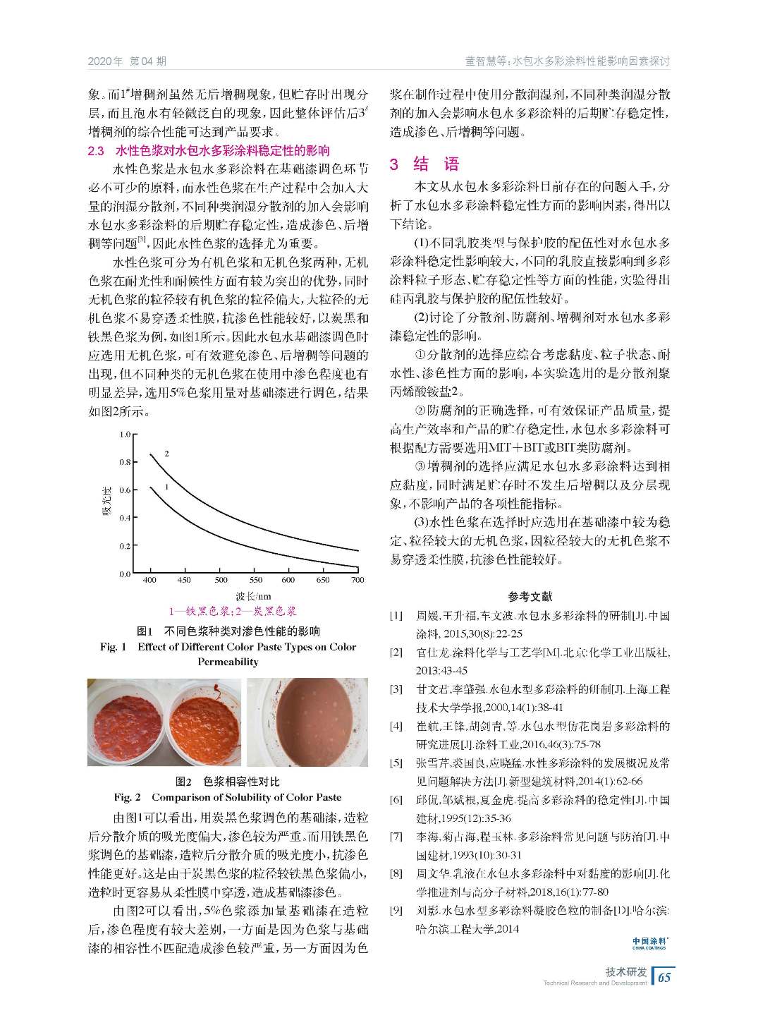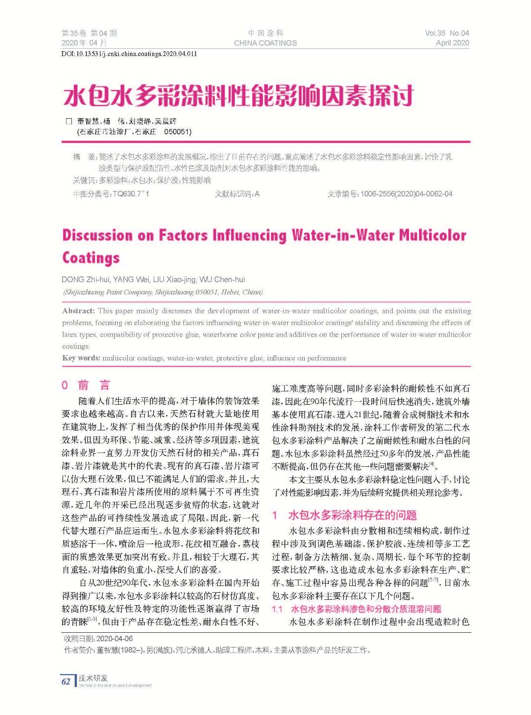 摘要:簡述了水包水多彩涂料的發展概況,指出了目前存在的問題。重點闡述了水包水多彩涂料穩定性影響因素,討論了乳膠類型與保護膠配伍性、水性色漿及助劑對水包水多彩涂料性能的影響。
