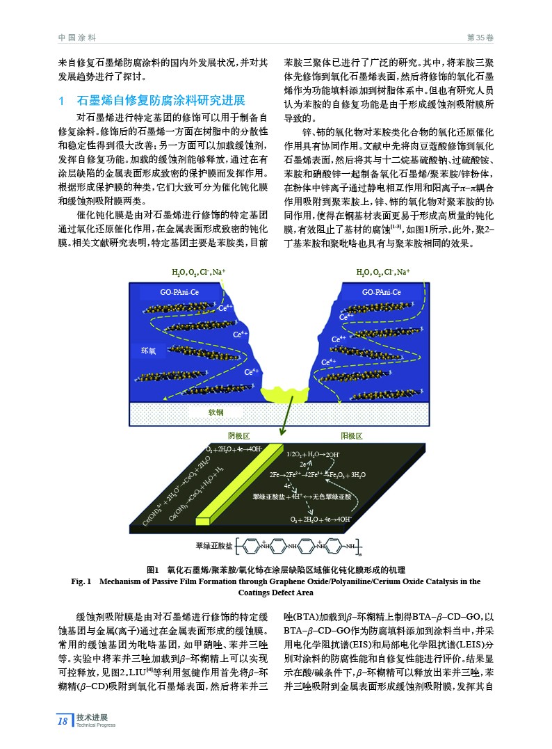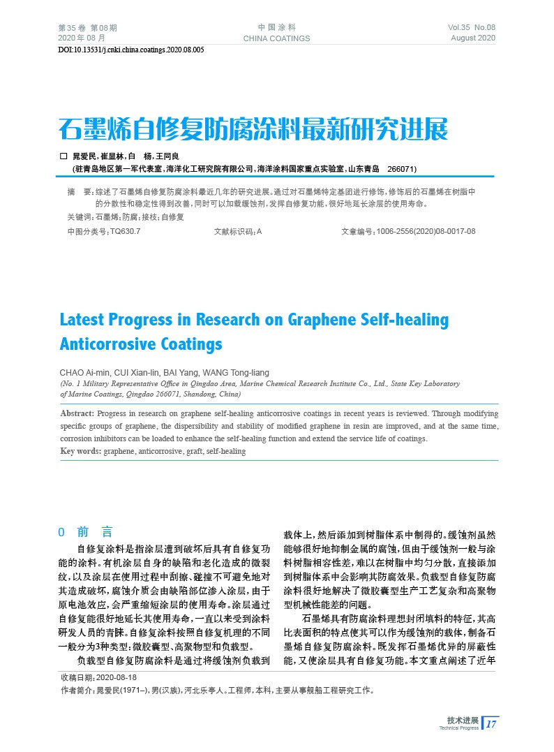 綜述了石墨烯自修復防腐涂料最近幾年的研究進展。通過對石墨烯特定基團進行修飾,修飾后的石墨烯在樹脂中的分散性和穩定性得到改善,同時可以加載緩蝕劑,發揮自修復功能,很好地延長涂層的使用壽命。