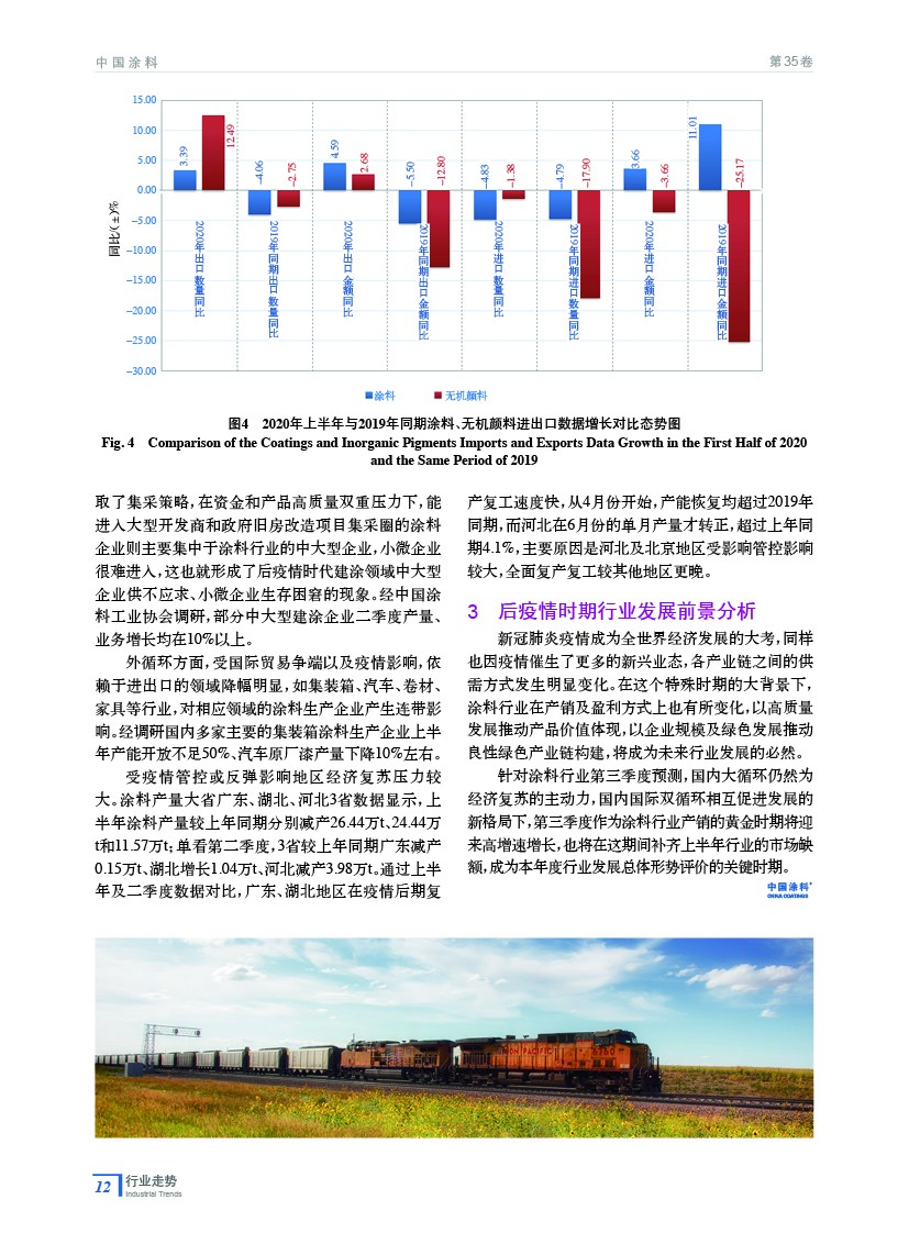 摘要:綜述了在新冠肺炎疫情影響下,我國涂料行業2020年上半年與2019年同期數據的對比分析,從產量、主營業務收入、利潤、進出口等方面總結了2020年上半年涂料行業發展形勢,介紹了后疫情時期涂料行業重點領域發展概況,并對未來行業發展進行了展望。