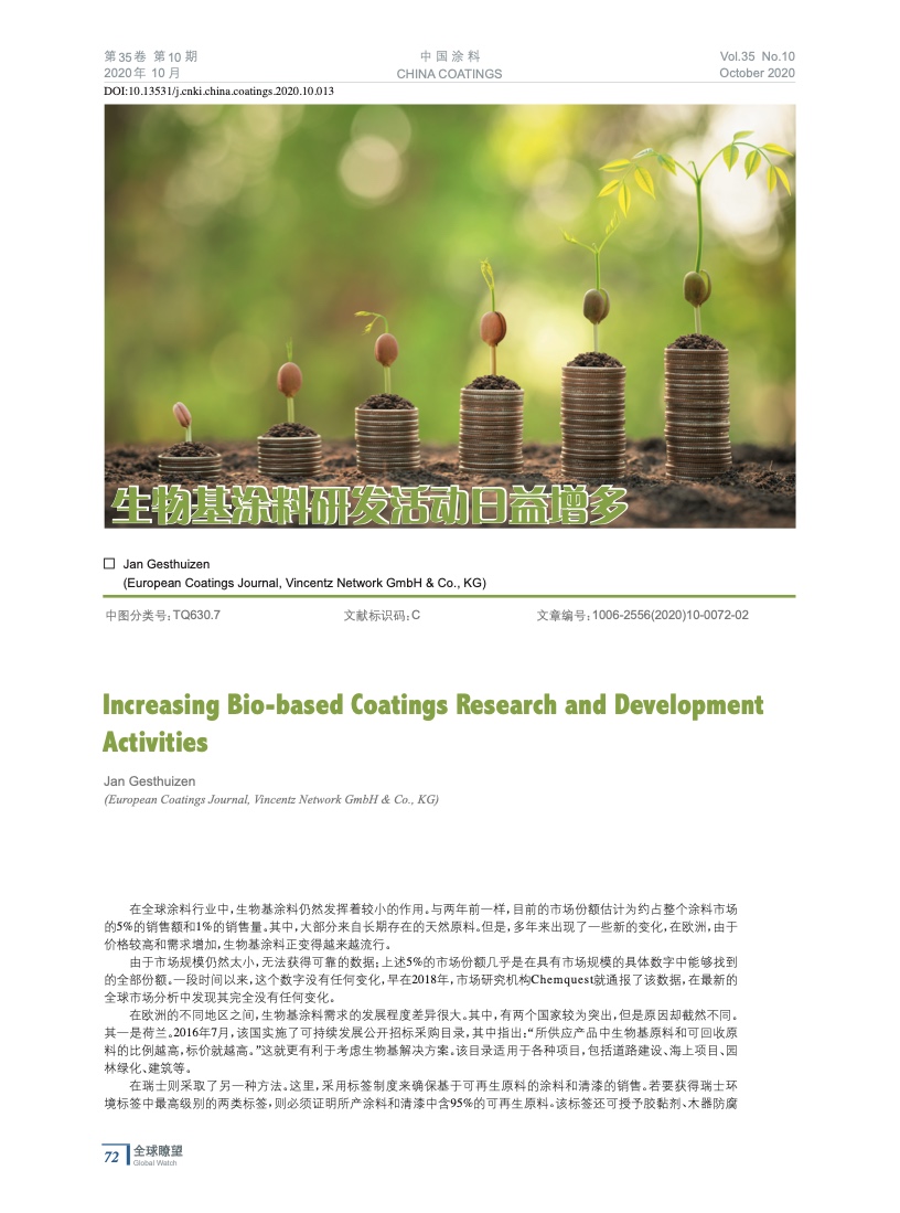 編者按:在全球涂料行業中,生物基涂料仍然發揮著較小的作用。與兩年前一樣,目前的市場份額估計為約占整個涂料市場的5%的銷售額和1%的銷售量。其中,大部分來自長期存在的天然原料。但是,多年來出現了一些新的變化,在歐洲,由于價格較高和需求增加,生物基涂料正變得越來越流行。