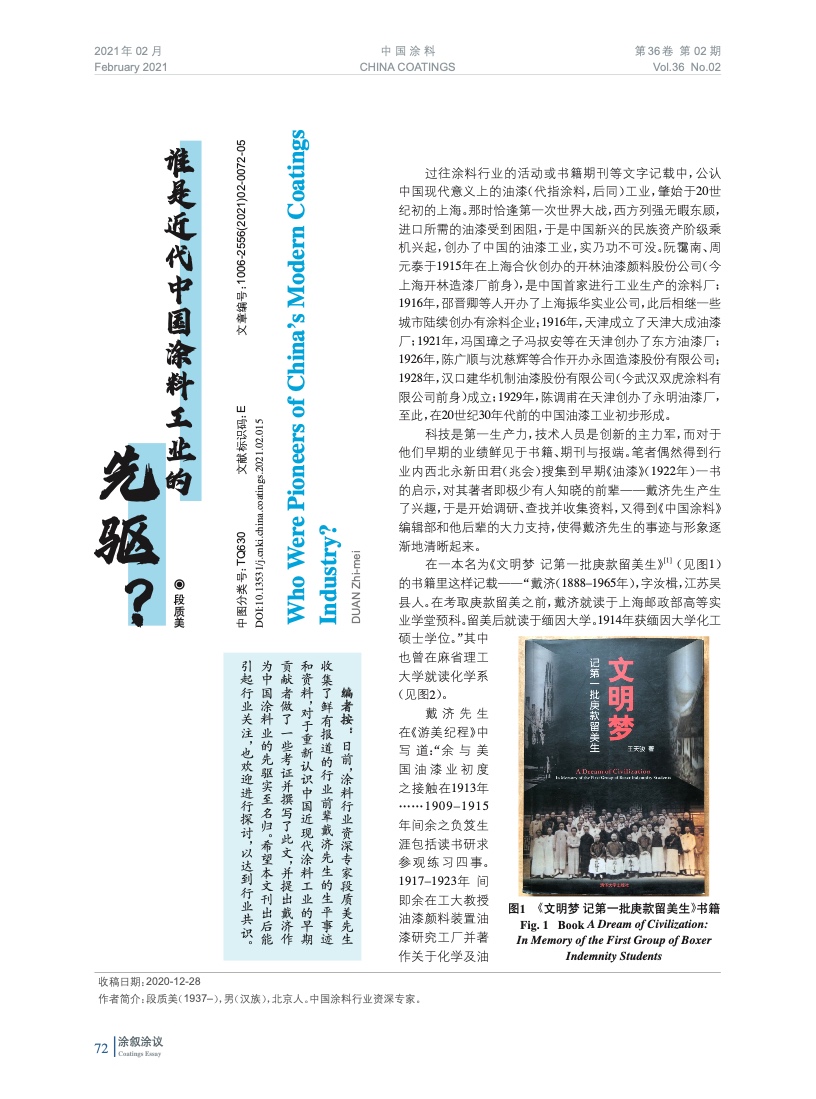 編者按:日前,涂料行業資深專家段質美先生收集了鮮有報道的行業前輩戴濟先生的生平事跡和資料,對于重新認識中國近現代涂料工業的早期貢獻者做了一些考證并撰寫了此文,并提出戴濟作為中國涂料業的先驅實至名歸。希望本文刊出后能引起行業關注,也歡迎進行探討,以達到行業共識。