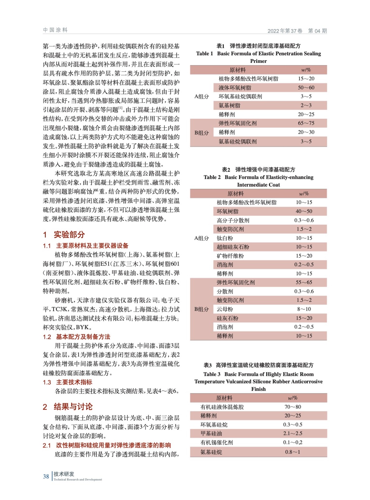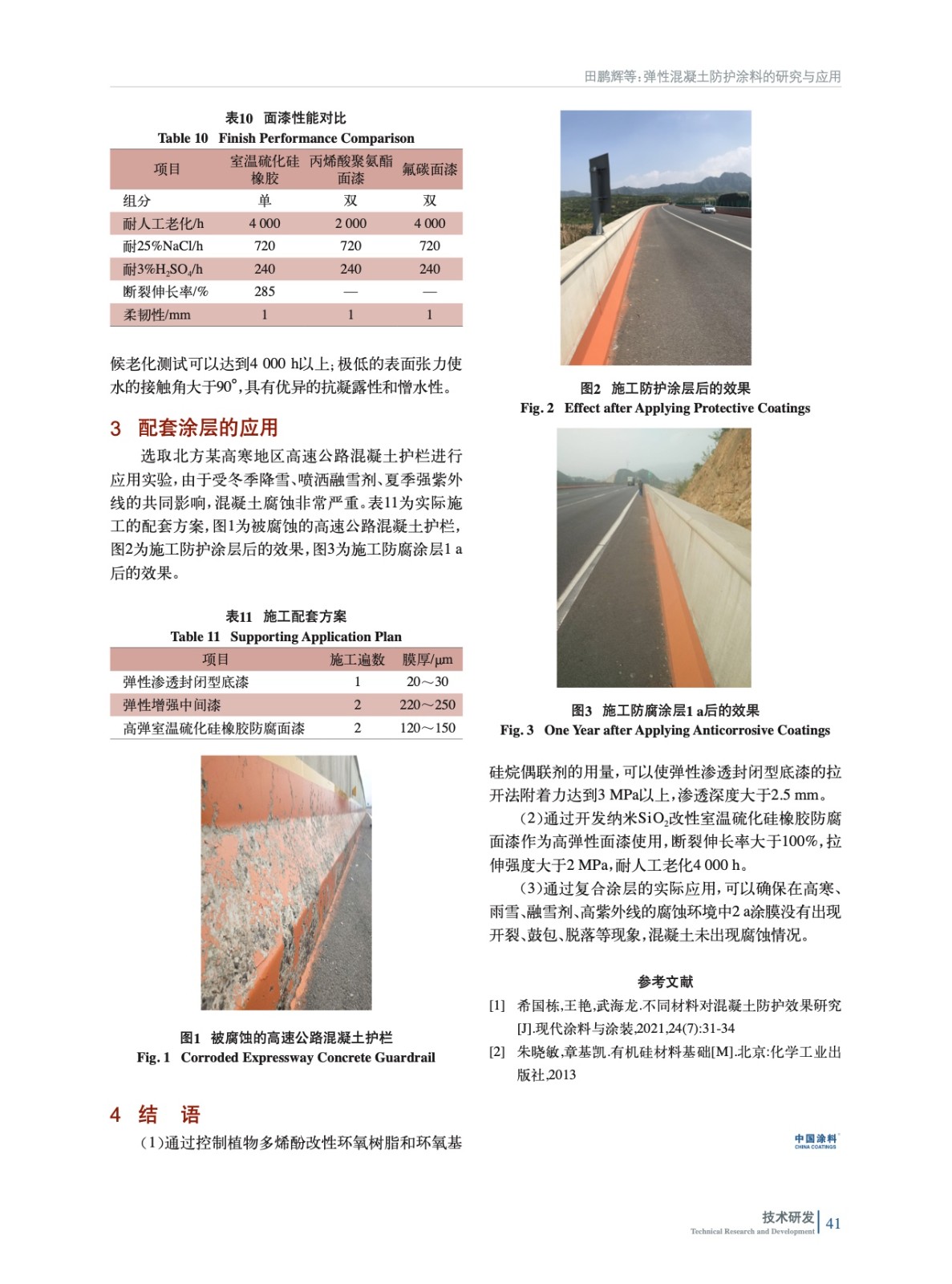 研究了混凝土防護彈性滲透封閉底漆、彈性中間漆、高彈室溫硫化硅橡膠防腐面漆的性能和應用效果。通過在北方某高寒地區高速公路護欄試用,經過1個整年的周期,涂膜完整,沒有出現失光、開裂、鼓包等問題,達到了混凝土防護的作用。