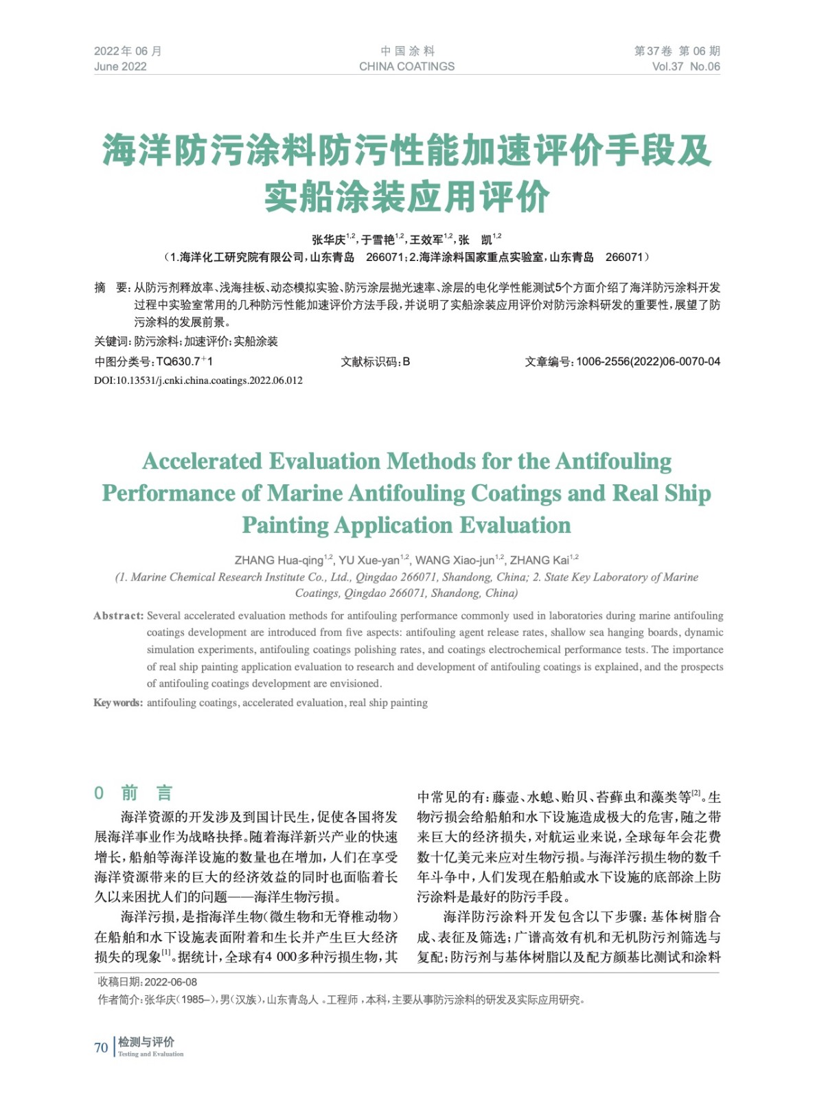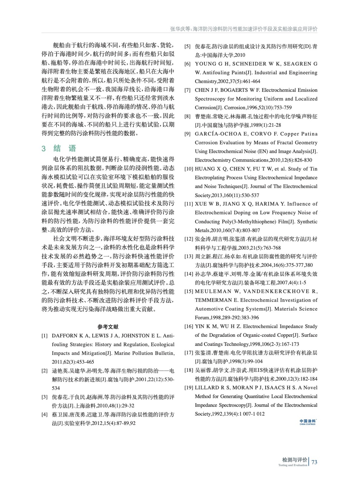 從防污劑釋放率、淺海掛板、動態模擬實驗、防污涂層拋光速率、涂層的電化學性能測試5個方面介紹了海洋防污涂料開發過程中實驗室常用的幾種防污性能加速評價方法手段,并說明了實船涂裝應用評價對防污涂料研發的重要性,展望了防污涂料的發展前景。