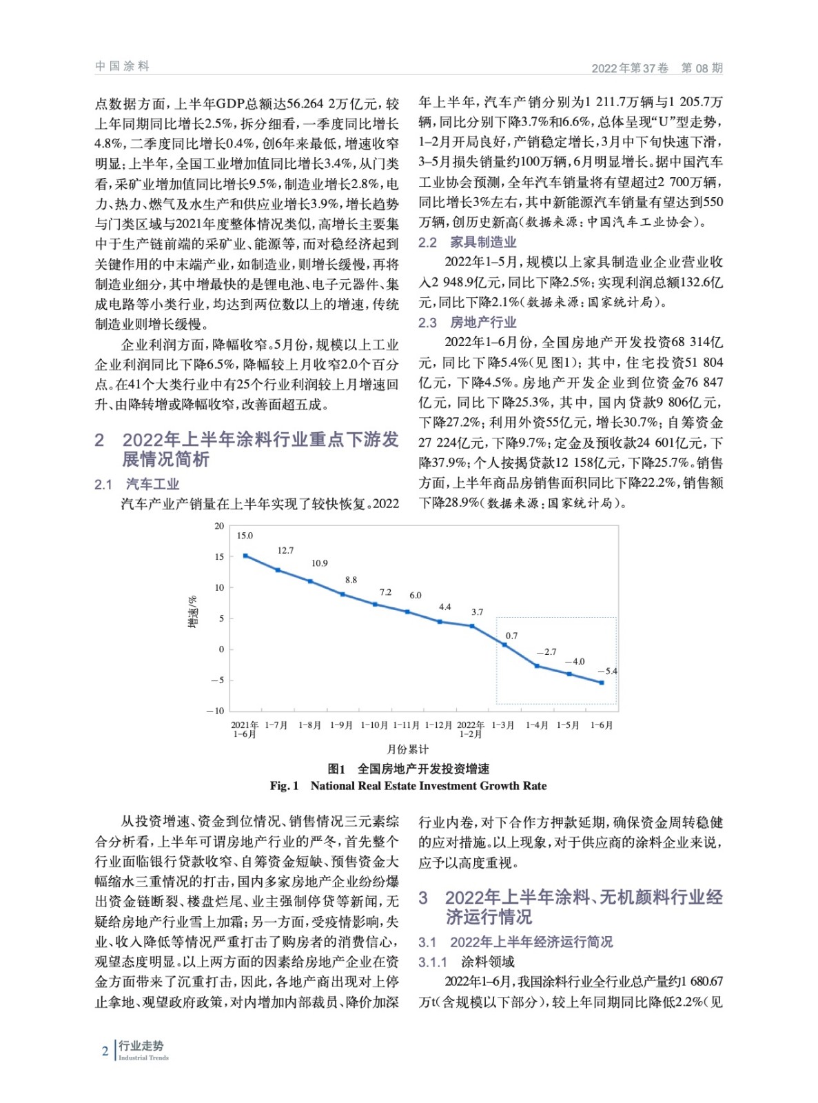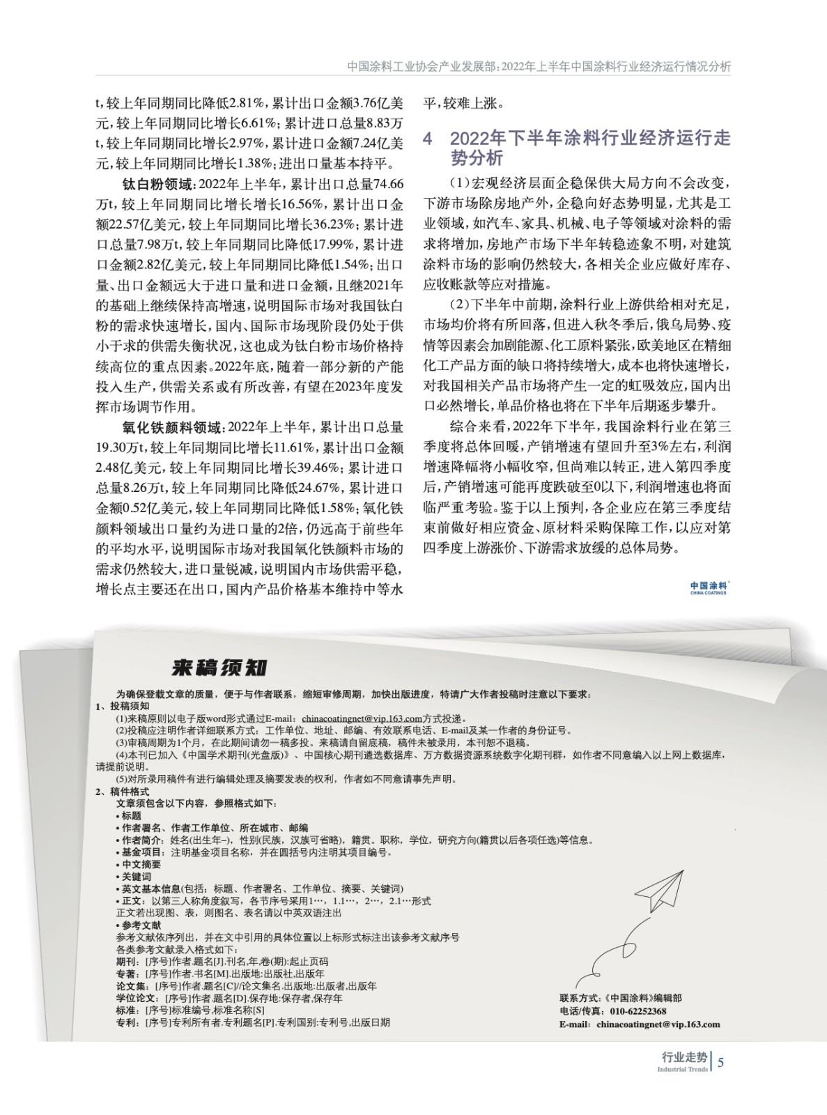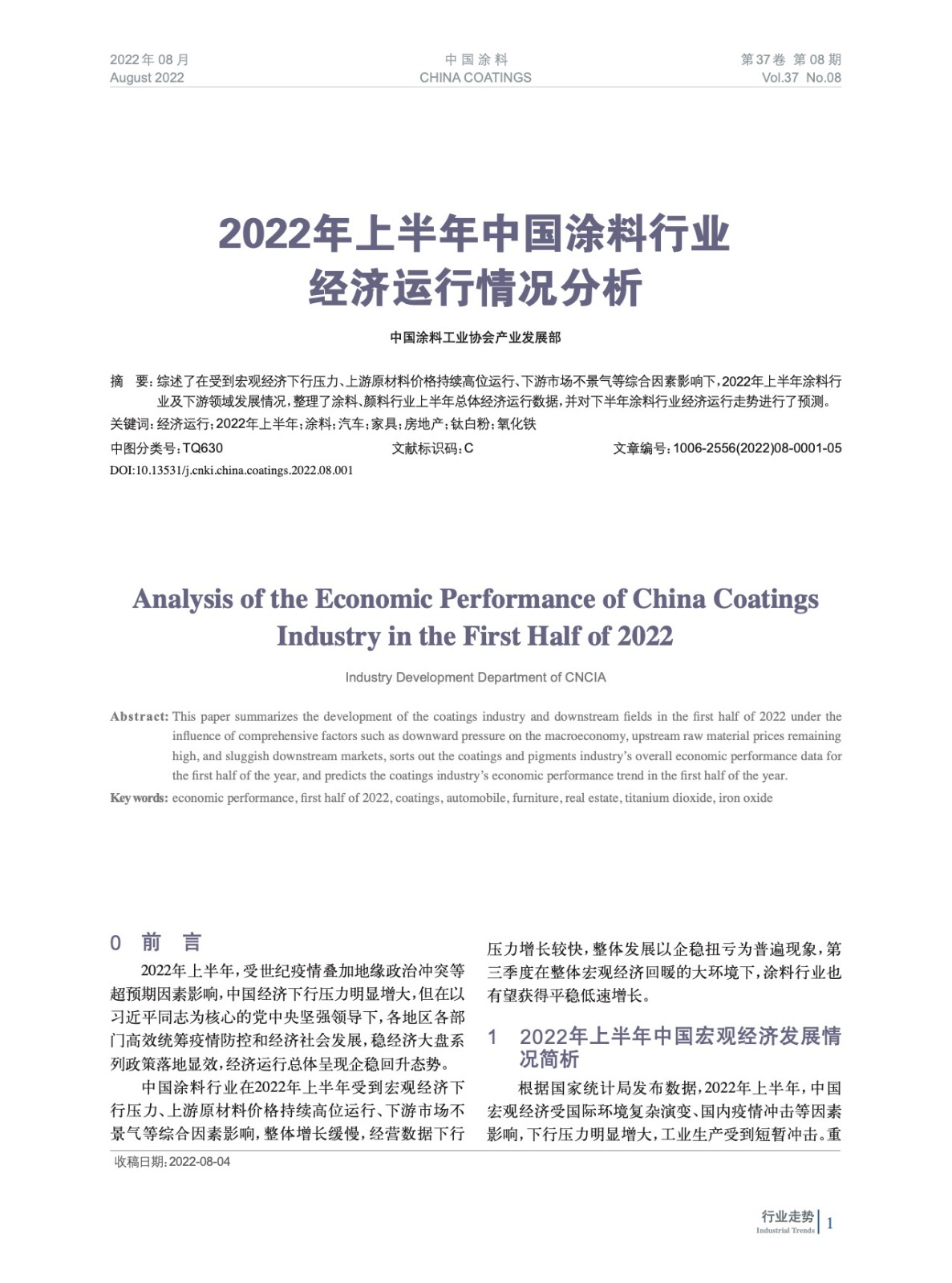 摘要:綜述了在受到宏觀經濟下行壓力、上游原材料價格持續高位運行、下游市場不景氣等綜合因素影響下,2022年上半年涂料行業及下游領域發展情況,整理了涂料、顏料行業上半年總體經濟運行數據,并對下半年涂料行業經濟運行走勢進行了預測。