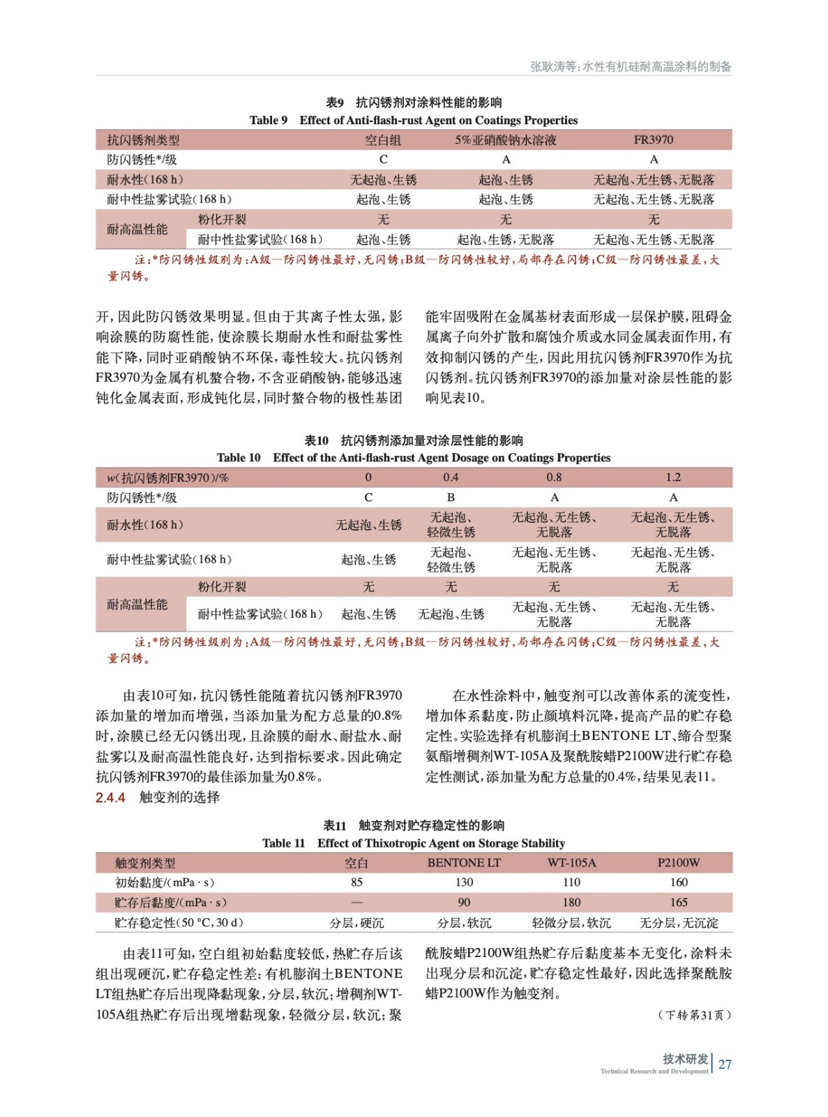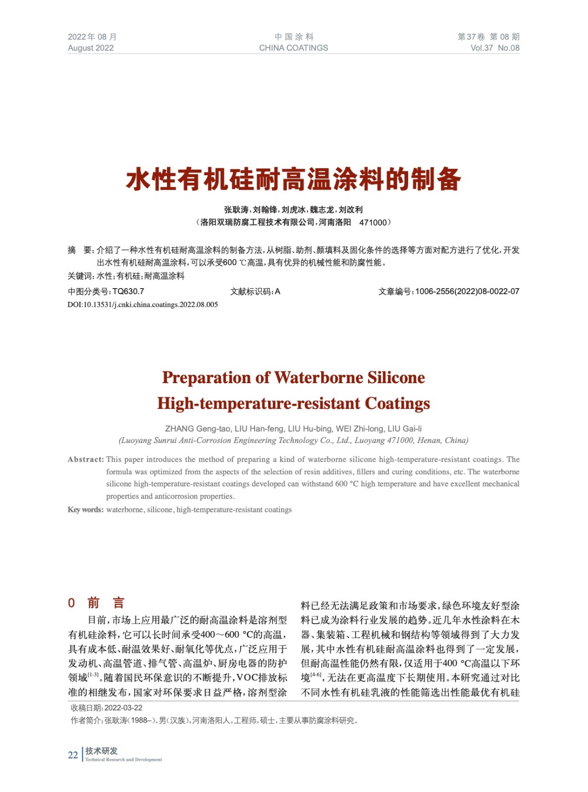 介紹了一種水性有機硅耐高溫涂料的制備方法,從樹脂、助劑、顏填料及固化條件的選擇等方面對配方進行了優化,開發出水性有機硅耐高溫涂料,可以承受600 ℃高溫,具有優異的機械性能和防腐性能。