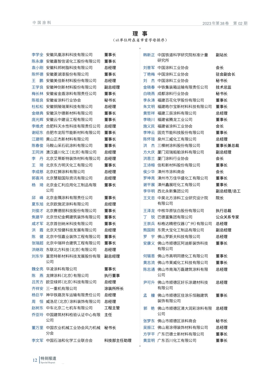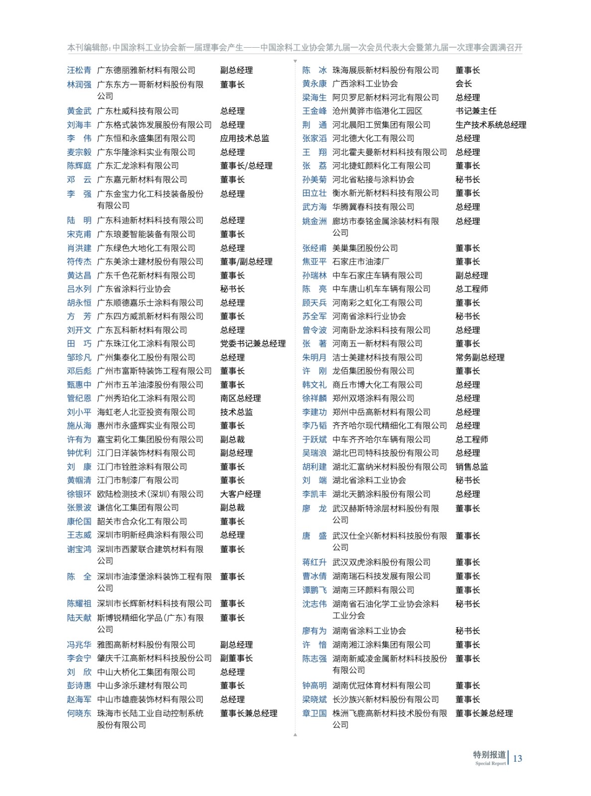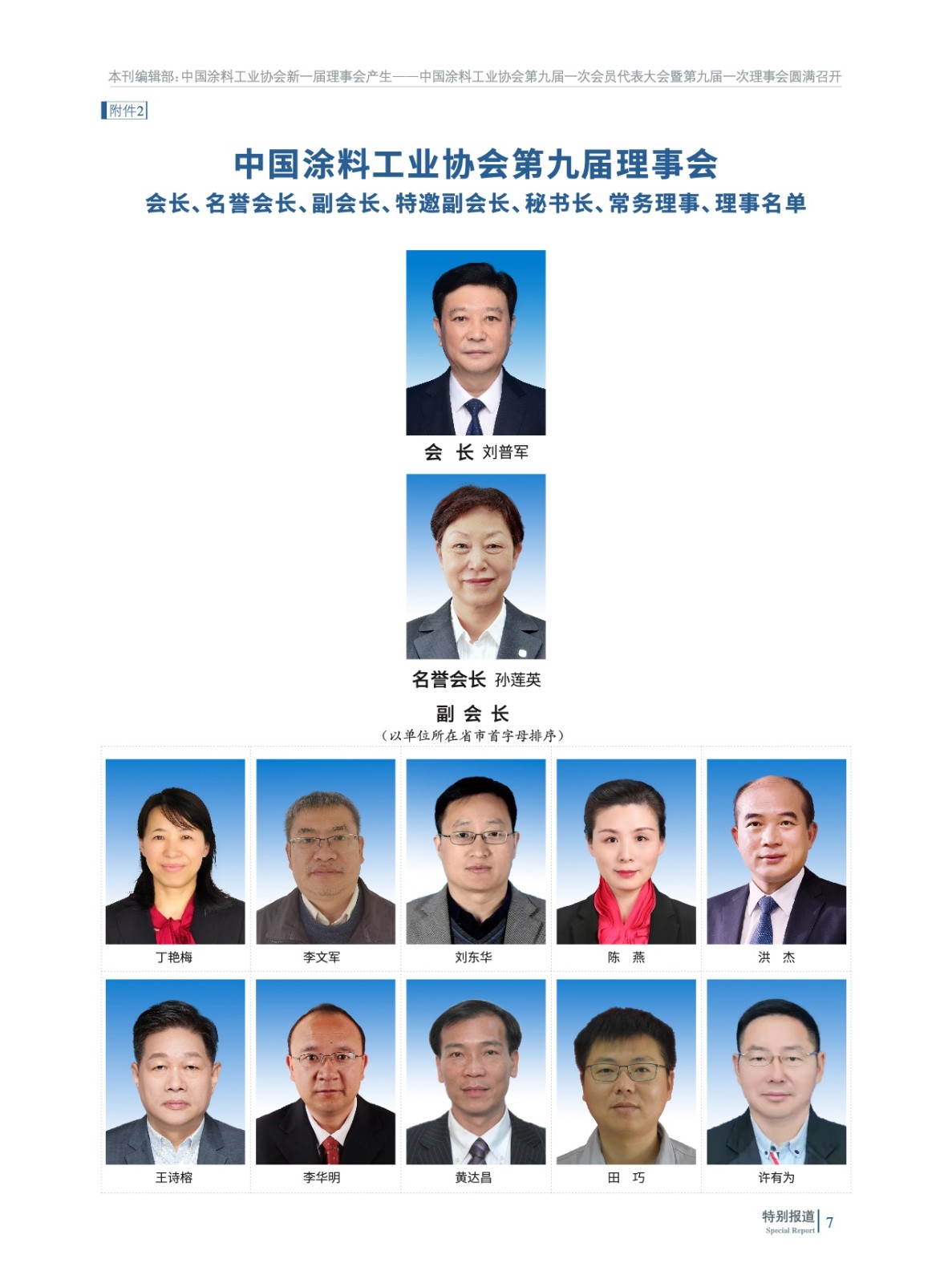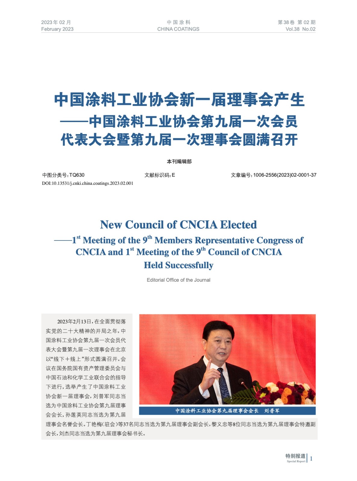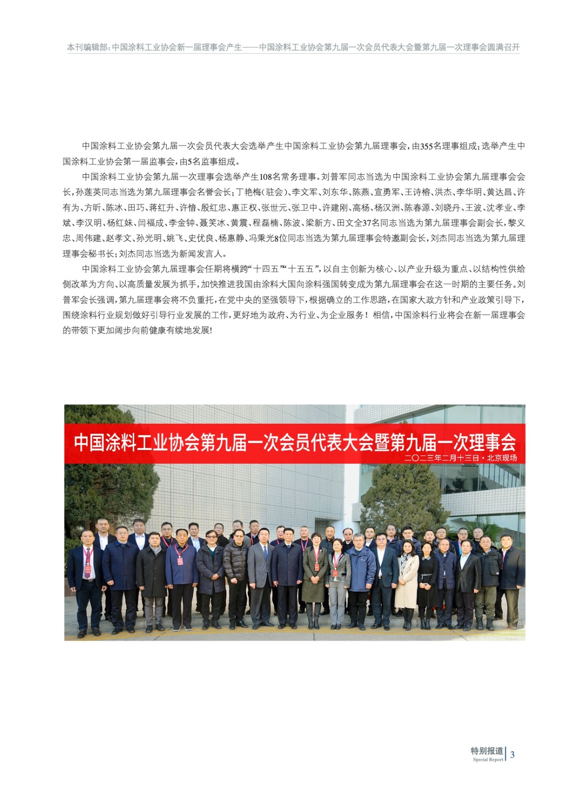 摘要:2023年2月13日,中國涂料工業協會第九屆一次會員代表大會暨第九屆一次理事會在北京以“線下+線上”形式圓滿召開。會議在國務院國有資產管理委員會與中國石油和化學工業聯合會的指導下進行,選舉產生了中國涂料工業協會新一屆理事會,劉普軍同志當選為中國涂料工業協會第九屆理事會會長,孫蓮英同志當選為第九屆理事會名譽會長。丁艷梅(駐會)等37名同志當選為第九屆理事會副會長,黎義忠等8位同志當選為第九屆理事會特邀副會長,劉杰同志當選為第九屆理事會秘書長。