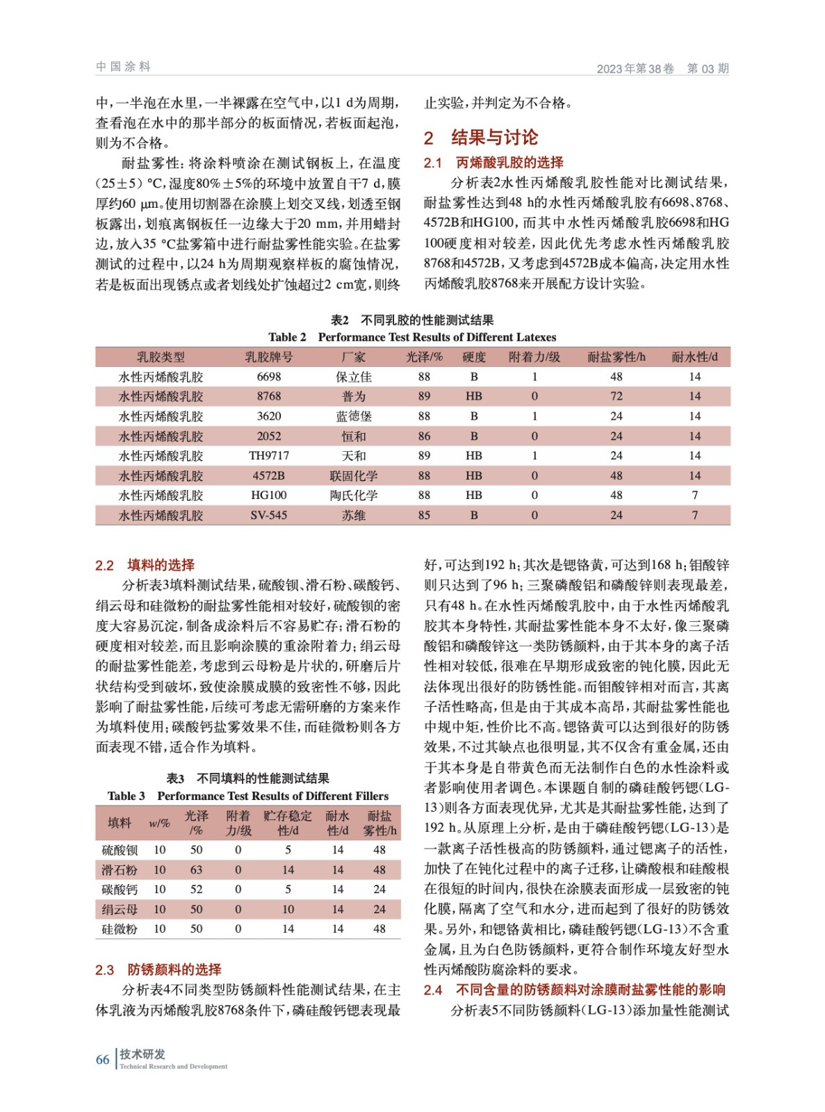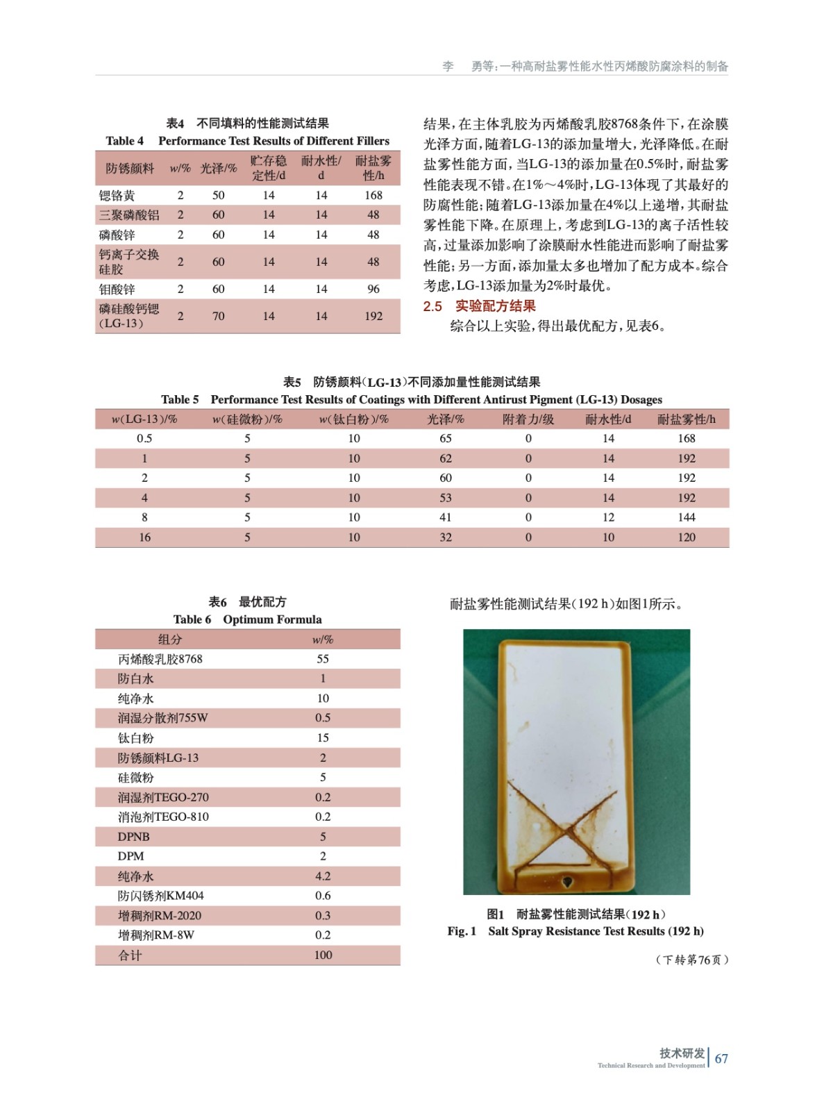 通過自制防銹顏料來提高配方耐鹽霧性能,優選乳液、填料和防銹顏料的添加量,制備了一款環境友好型單組分水性丙烯酸防腐涂料,其不含重金屬,耐鹽霧性能達到192 h以上。