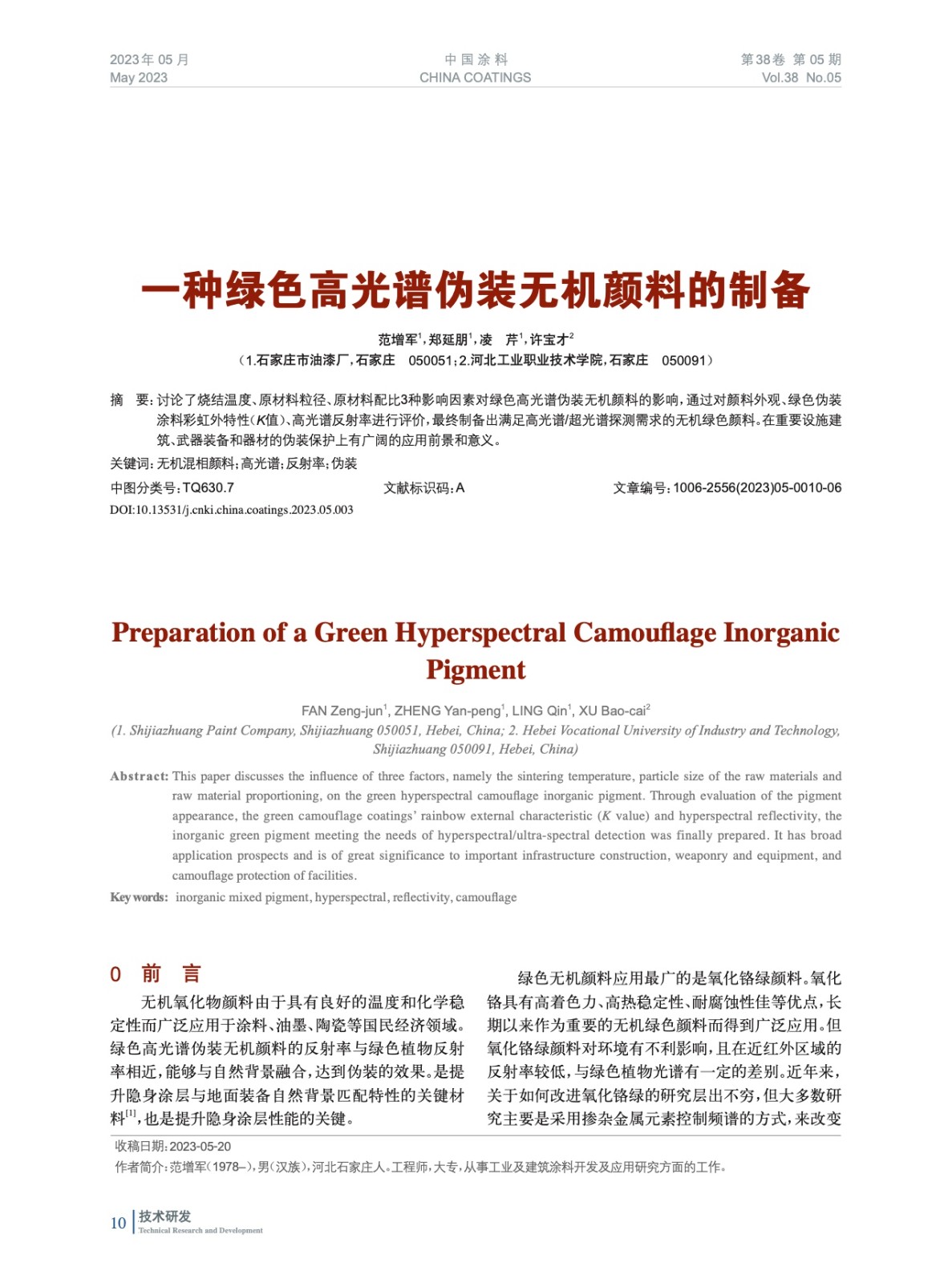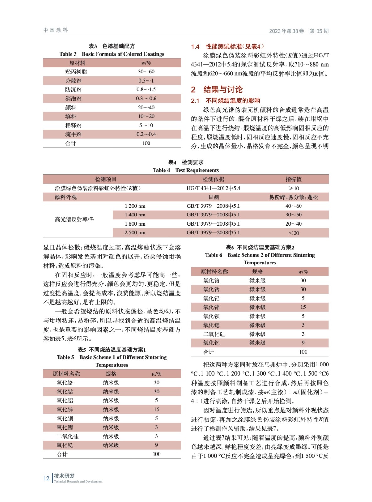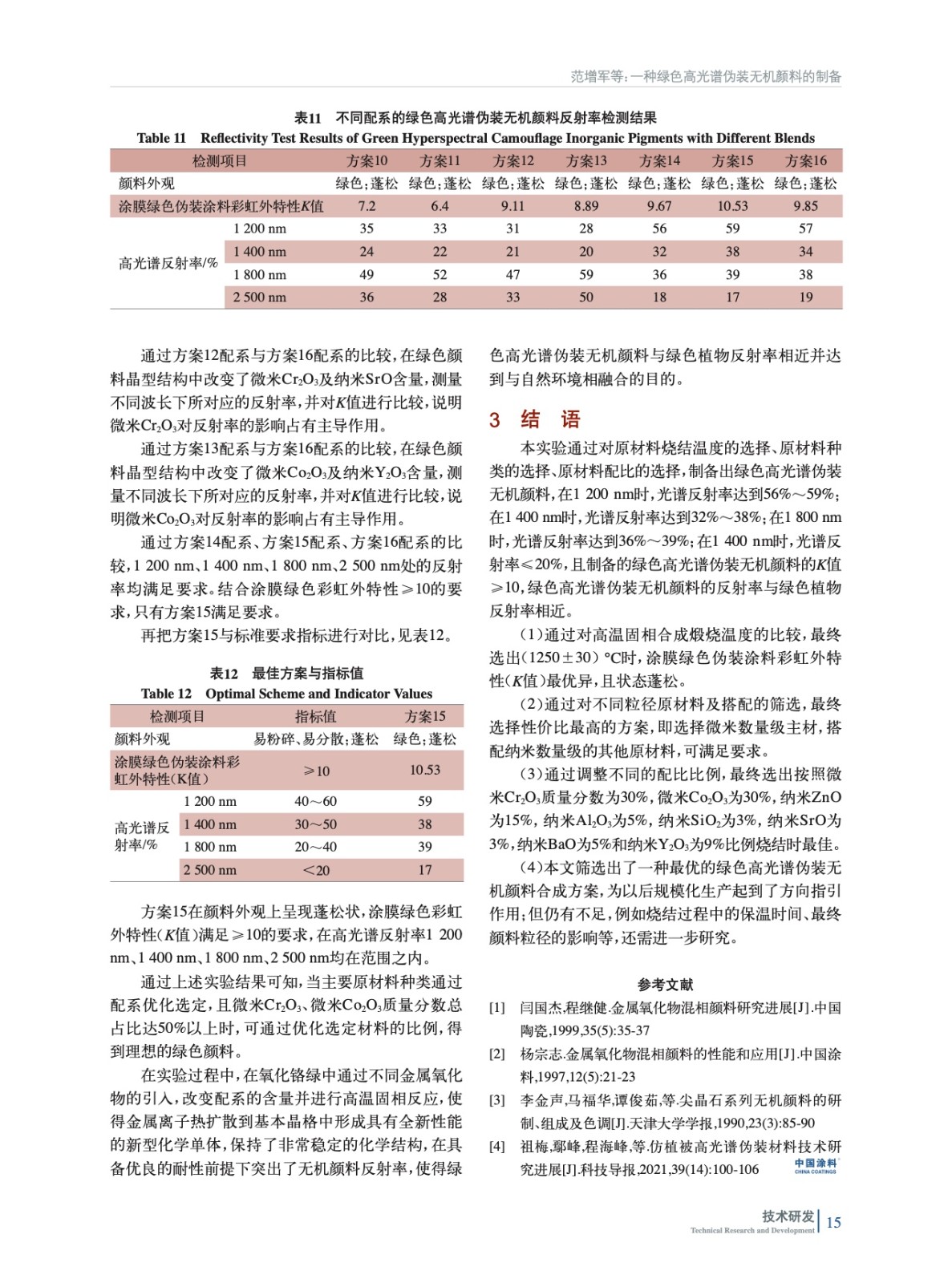 討論了燒結溫度、原材料粒徑、原材料配比3種影響因素對綠色高光譜偽裝無機顏料的影響,通過對顏料外觀、綠色偽裝涂料彩虹外特性(K值)、高光譜反射率進行評價,最終制備出滿足高光譜/超光譜探測需求的無機綠色顏料。在重要設施建筑、武器裝備和器材的偽裝保護上有廣闊的應用前景和意義。