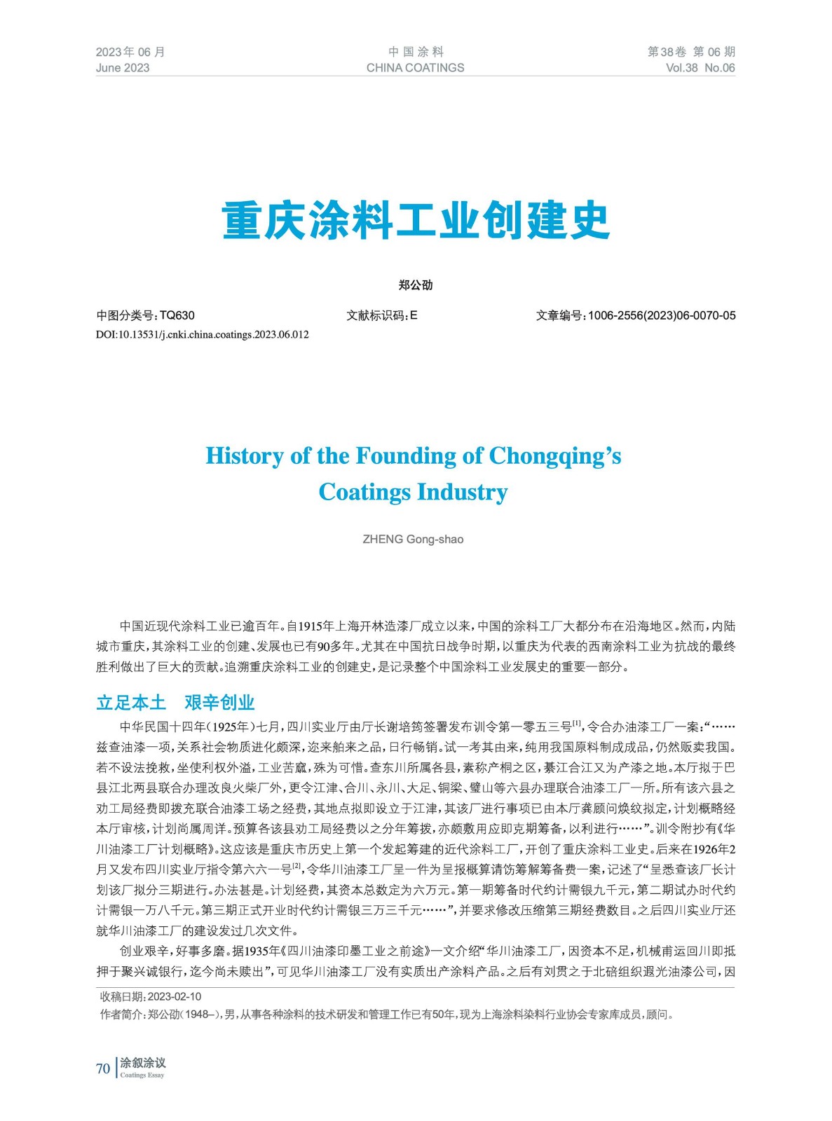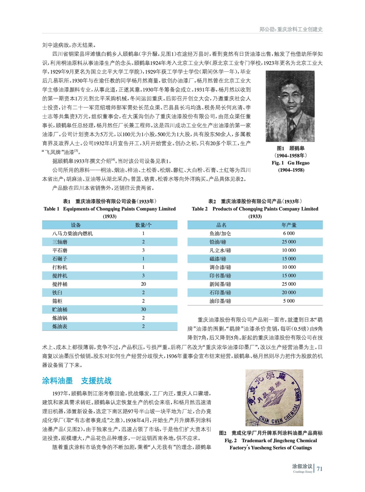 中國近現代涂料工業已逾百年。自1915年上海開林造漆廠成立以來,中國的涂料工廠大都分布在沿海地區。然而,內陸城市重慶,其涂料工業的創建、發展也已有90多年。尤其在中國抗日戰爭時期,以重慶為代表的西南涂料工業為抗戰的最終勝利做出了巨大的貢獻。追溯重慶涂料工業的創建史,是記錄整個中國涂料工業發展史的重要一部分。
