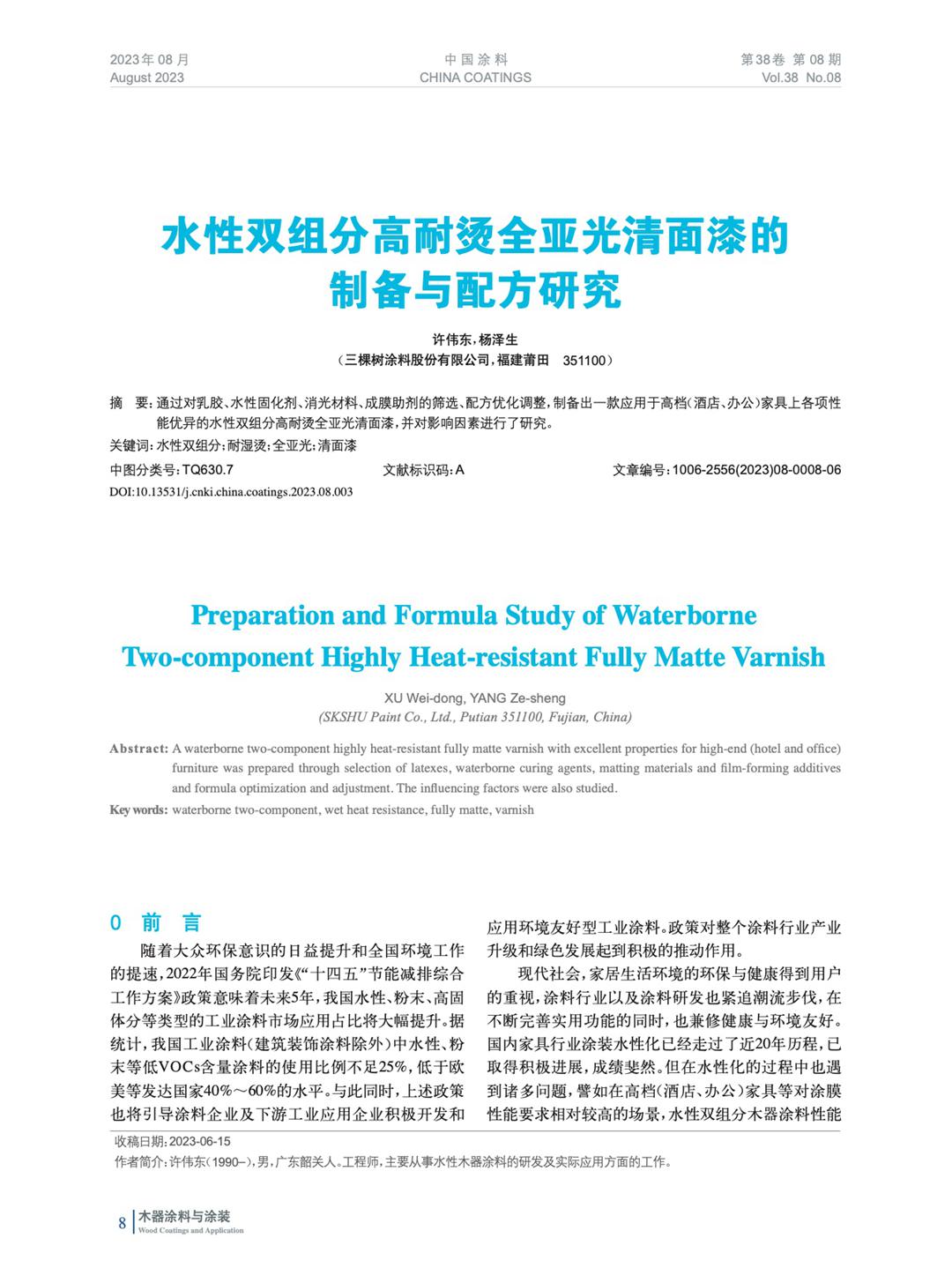 摘要:通過對乳膠、水性固化劑、消光材料、成膜助劑的篩選、配方優化調整,制備出一款應用于高檔(酒店、辦公)家具上各項性能優異的水性雙組分高耐燙全亞光清面漆,并對影響因素進行了研究。