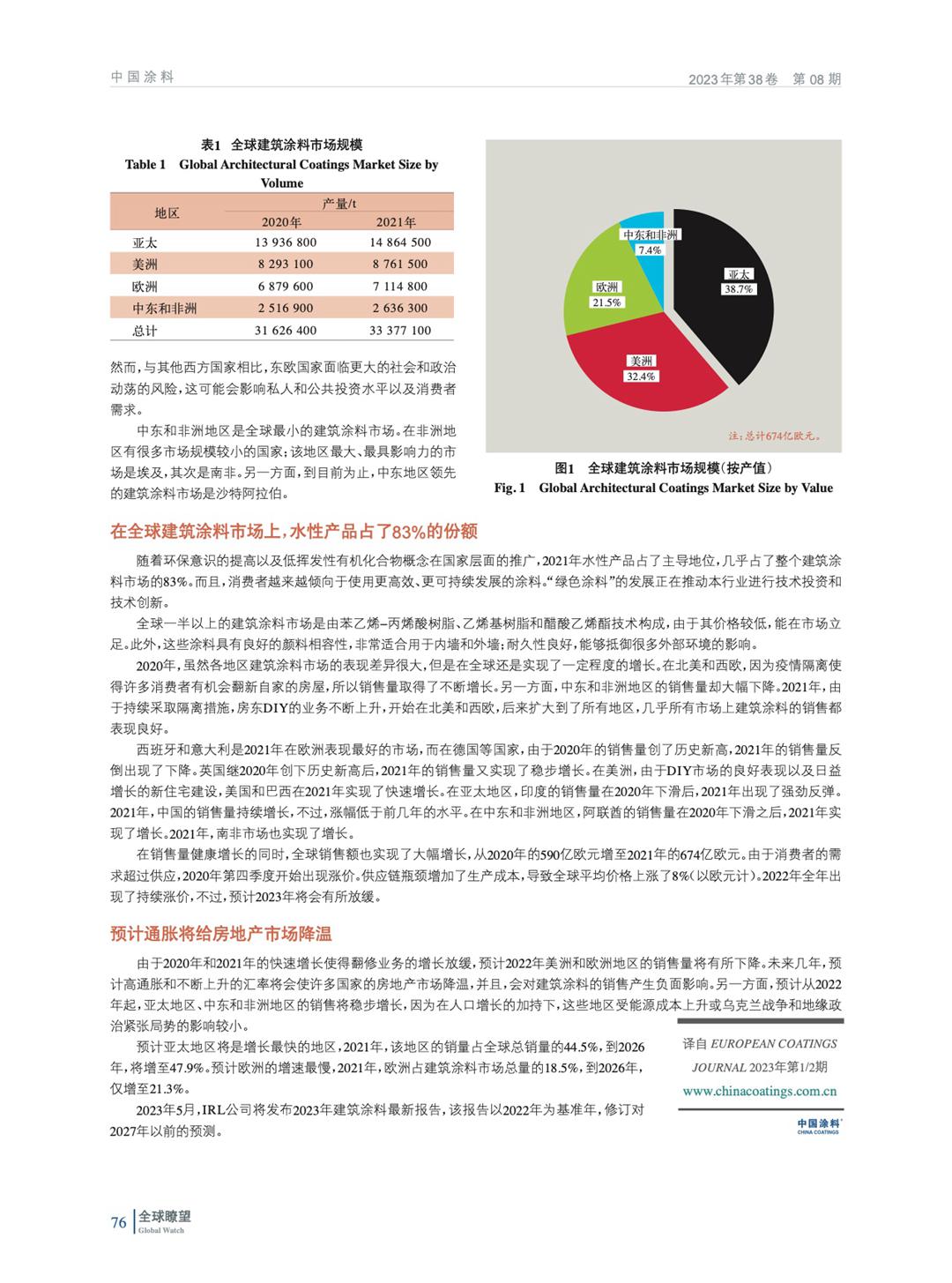 摘要:2022年5月,IRL公司完成了建筑涂料的年度報告計劃。根據IRL公司的研究,2021年全球建筑涂料市場銷售量約為3 340萬,假設全球平均價格為2.02歐元/kg,那么市場的銷售額為674億歐元。