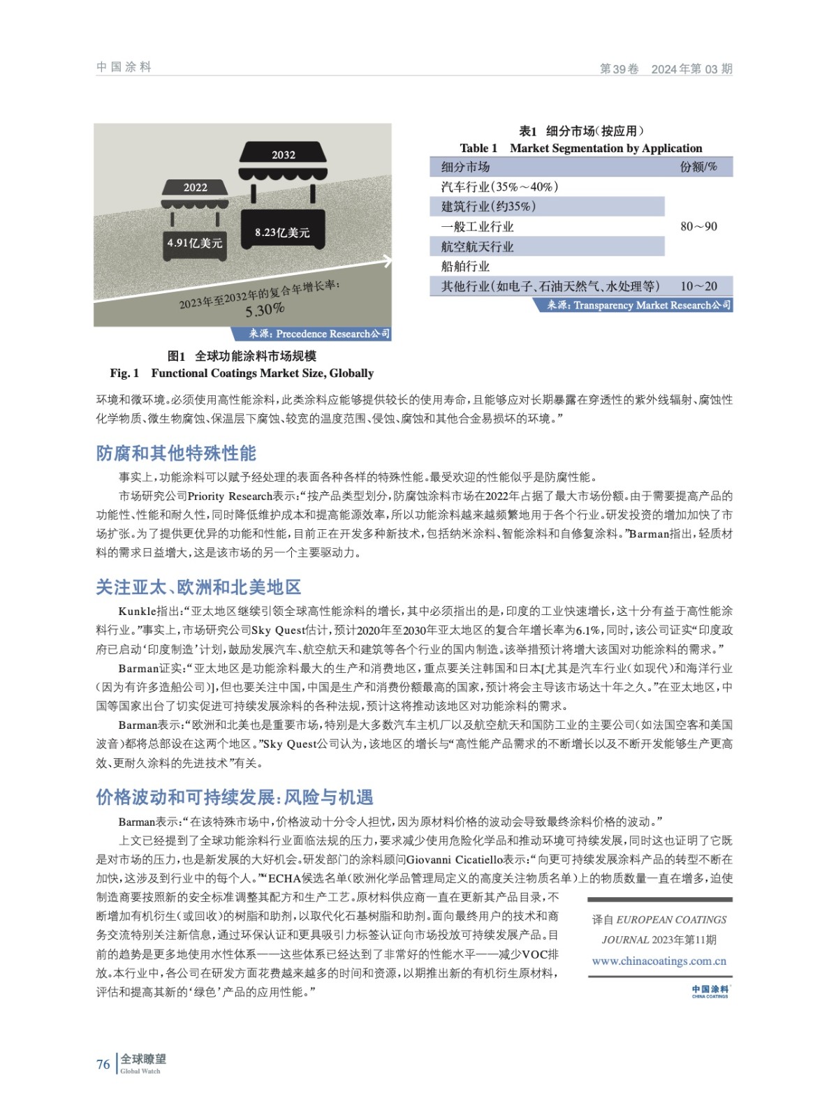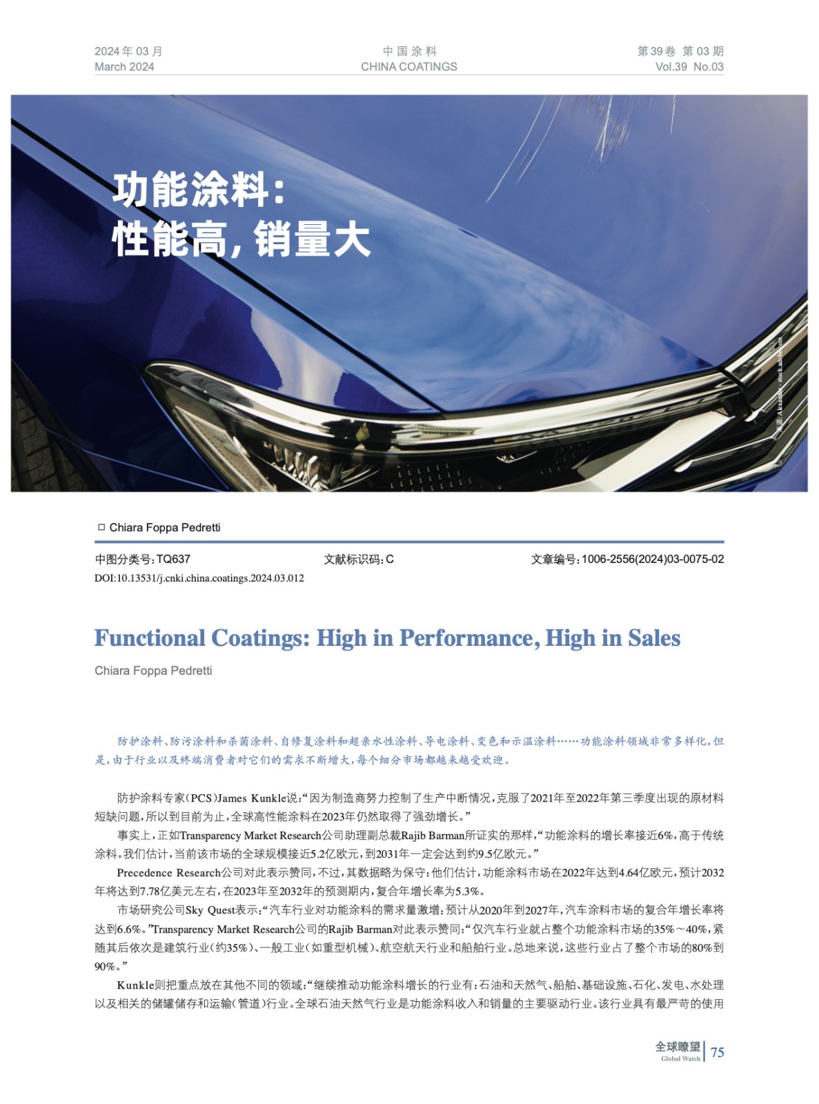 摘要:編者按:防護涂料、防污涂料和殺菌涂料、自修復涂料和超親水性涂料、導電涂料、變色和示溫涂料……功能涂料領域非常多樣化,但是,由于行業以及終端消費者對它們的需求不斷增大,每個細分市場都越來越受歡迎。