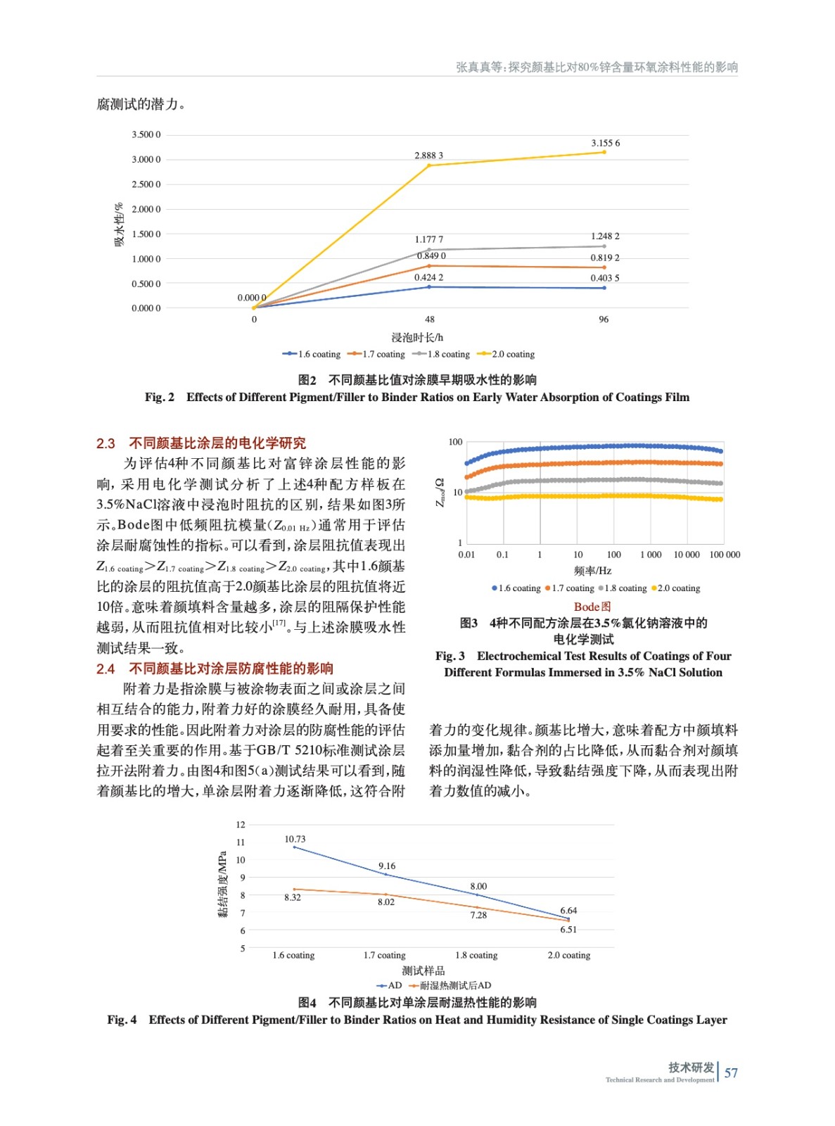 摘要:在80%鋅含量環(huán)氧涂料中,以長(zhǎng)石粉作為另一種輔助顏填料,通過(guò)改變總顏填料與基料的比例(即顏基比),制備了臨界狀態(tài)附近4種不同顏基比(1.6、1.7、1.8以及2.0)的涂料樣品,并探究了顏基比對(duì)涂膜形成結(jié)構(gòu)以及涂膜防腐蝕性能的影響。測(cè)試結(jié)果顯示,隨著顏基比的增加,4種測(cè)試涂層的吸水率增大,96 h泡水測(cè)試后,顏基比為2.0的涂層吸水率約為1.6顏基比涂層的7.8倍;電化學(xué)測(cè)試Bode圖中低頻阻抗模量(Z0.01 Hz)減小,1.6顏基比涂層的阻抗值約為2.0顏基比涂層阻抗值的10倍,意味著涂層的阻隔性能減弱;連續(xù)冷凝、耐鹽霧以及耐濕熱防腐測(cè)試后涂膜的附著力均有所降低,表明了涂膜的防腐性能降低。盡管顏基比越高涂料的價(jià)格降低,但從環(huán)氧富鋅底漆應(yīng)具備良好的防銹性能再追求性價(jià)比的角度考慮,顏基比建議不高于2.0,以確保防腐測(cè)試后涂層仍具有優(yōu)異的附著力(不低于5 MPa)。