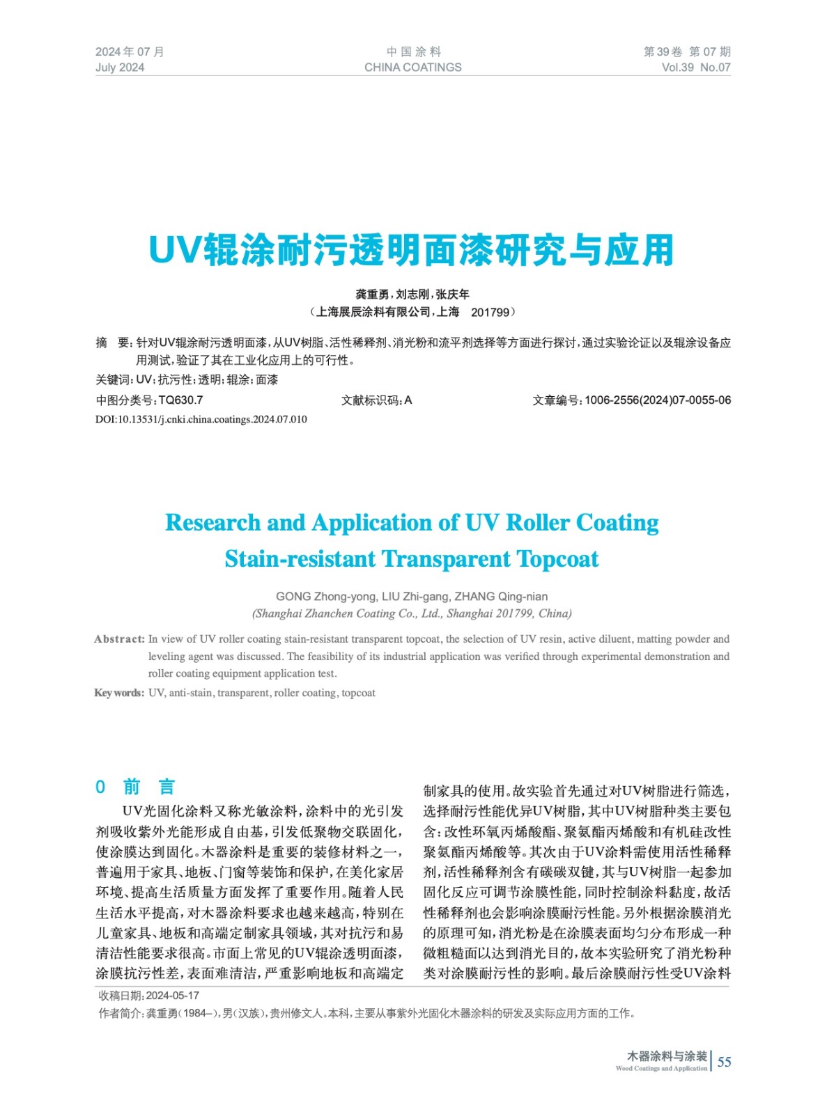 摘要:對UV輥涂耐污透明面漆,從UV樹脂、活性稀釋劑、消光粉和流平劑選擇等方面進行探討,通過實驗論證以及輥涂設備應用測試,驗證了其在工業化應用上的可行性。