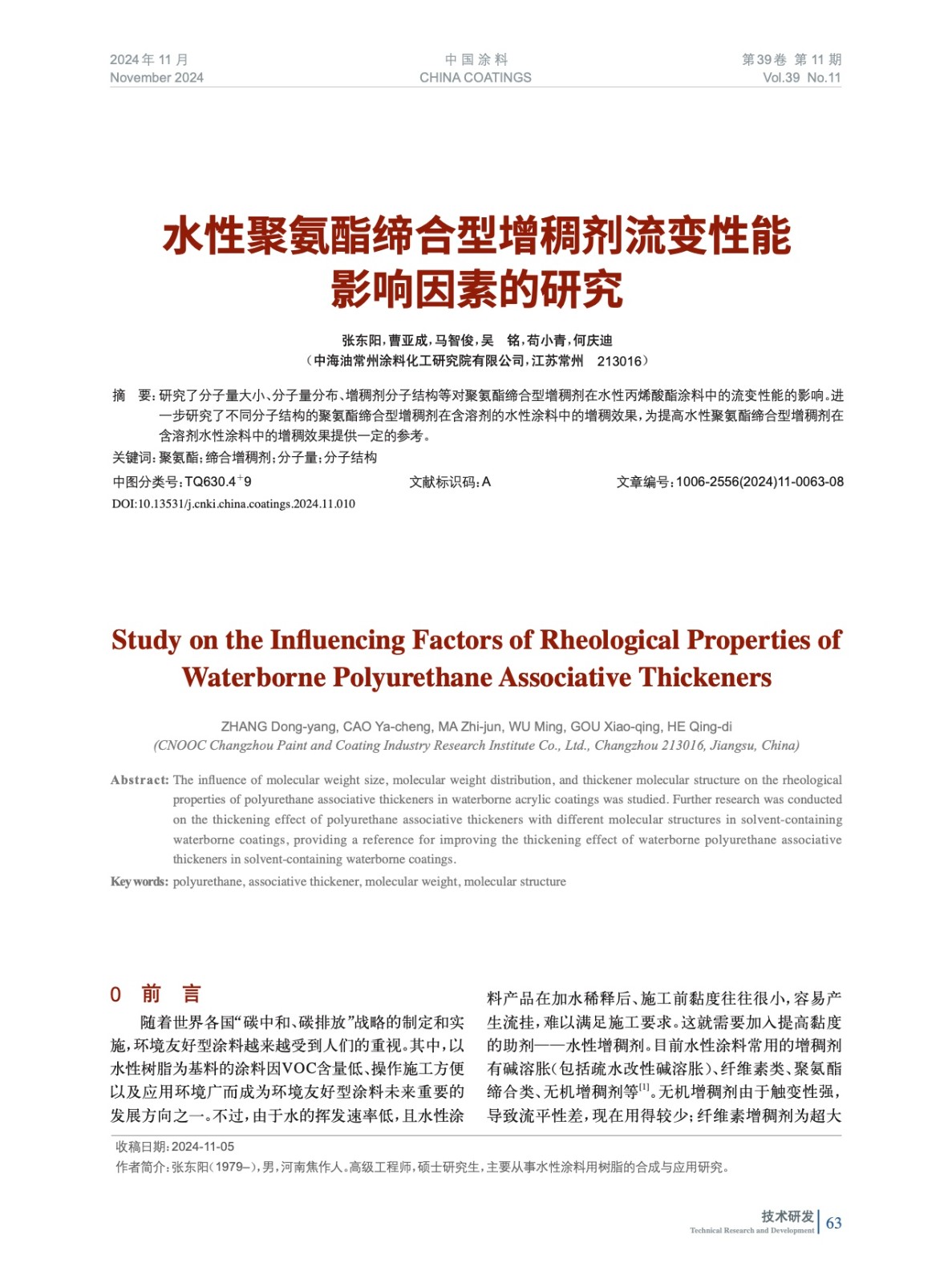 摘要:研究了分子量大小、分子量分布、增稠劑分子結構等對聚氨酯締合型增稠劑在水性丙烯酸酯涂料中的流變性能的影響。進一步研究了不同分子結構的聚氨酯締合型增稠劑在含溶劑的水性涂料中的增稠效果,為提高水性聚氨酯締合型增稠劑在含溶劑水性涂料中的增稠效果提供一定的參考。