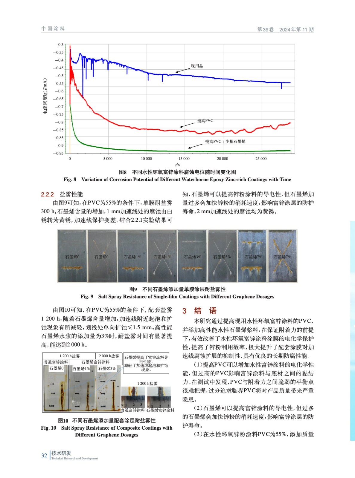 摘要:為改善現(xiàn)用水性環(huán)氧富鋅涂料對(duì)鐵基材的電化學(xué)保護(hù)性能,需提高富鋅涂層的導(dǎo)電性,且不能影響配套涂層的長(zhǎng)期防腐性能。通過(guò)提高配方中的顏料體積濃度(PVC),同時(shí)添加適量的高性能石墨烯漿料,制備了一種具有優(yōu)良電化學(xué)保護(hù)性能和防腐性能的水性環(huán)氧石墨烯富鋅涂料。在配方PVC調(diào)整到55%,高性能石墨烯水漿質(zhì)量分?jǐn)?shù)為3%的情況下,所制備的水性環(huán)氧石墨烯富鋅涂層的綜合性能最好,其配套涂層經(jīng)中性鹽霧試驗(yàn)2 000 h后依然具有良好的附著力,加速線附近起泡和擴(kuò)蝕現(xiàn)象較現(xiàn)用產(chǎn)品有明顯改善,劃線處單向擴(kuò)蝕≤1.5 mm。在保證涂層附著力的前提下提高配方PVC,添加適量的高性能石墨烯漿料,提升了鋅粉的利用效率,改善涂層電化學(xué)性能的同時(shí)兼顧了涂層綜合性能的提升,全面改善整體配套的防腐性能,延長(zhǎng)了配套涂層使用壽命。