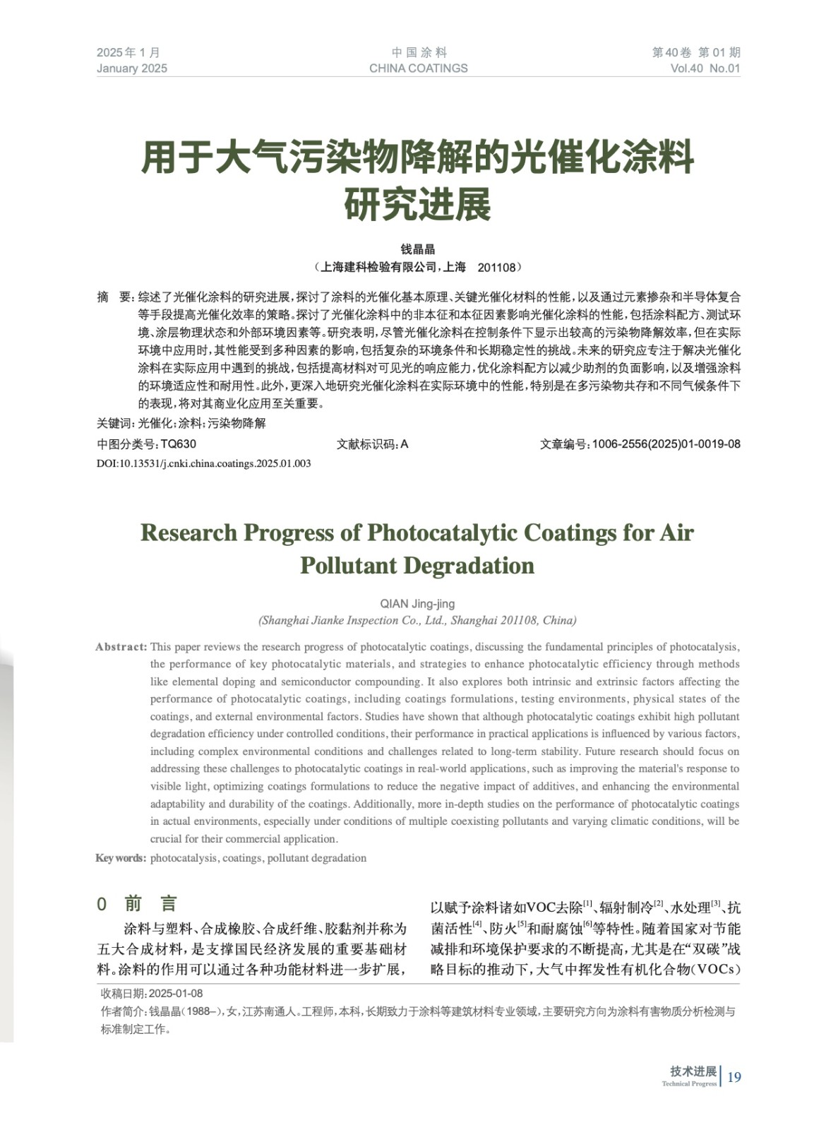 摘要:綜述了光催化涂料的研究進展,探討了涂料的光催化基本原理、關(guān)鍵光催化材料的性能,以及通過元素摻雜和半導(dǎo)體復(fù)合等手段提高光催化效率的策略。探討了光催化涂料中的非本征和本征因素影響光催化涂料的性能,包括涂料配方、測試環(huán)境、涂層物理狀態(tài)和外部環(huán)境因素等。研究表明,盡管光催化涂料在控制條件下顯示出較高的污染物降解效率,但在實際環(huán)境中應(yīng)用時,其性能受到多種因素的影響,包括復(fù)雜的環(huán)境條件和長期穩(wěn)定性的挑戰(zhàn)。未來的研究應(yīng)專注于解決光催化涂料在實際應(yīng)用中遇到的挑戰(zhàn),包括提高材料對可見光的響應(yīng)能力,優(yōu)化涂料配方以減少助劑的負面影響,以及增強涂料的環(huán)境適應(yīng)性和耐用性。此外,更深入地研究光催化涂料在實際環(huán)境中的性能,特別是在多污染物共存和不同氣候條件下的表現(xiàn),將對其商業(yè)化應(yīng)用至關(guān)重要。