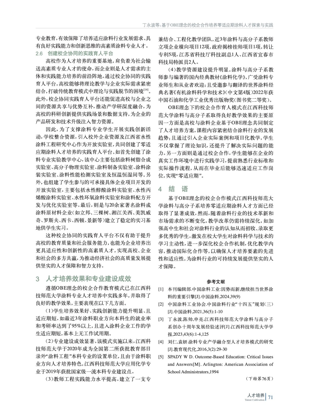 摘要:論述了當前涂料行業人才需求現狀及涂料類人才培養存在的問題;闡述了基于成果導向教育(OBE)理念的校企合作人才培養模式;介紹了基于OBE理念的校企合作模式在江西科技師范大學培養零適應期涂料人才方面的探索與實踐,包括制定遵循OBE理念的校企合作人才培養方案、重構課程體系、創新教學模式、建立評價體系等具體措施。實踐結果表明,基于OBE理念的校企合作模式有效縮短了大學畢業生適應期,提高了就業競爭力,為涂料行業輸送了高素質應用型人才。