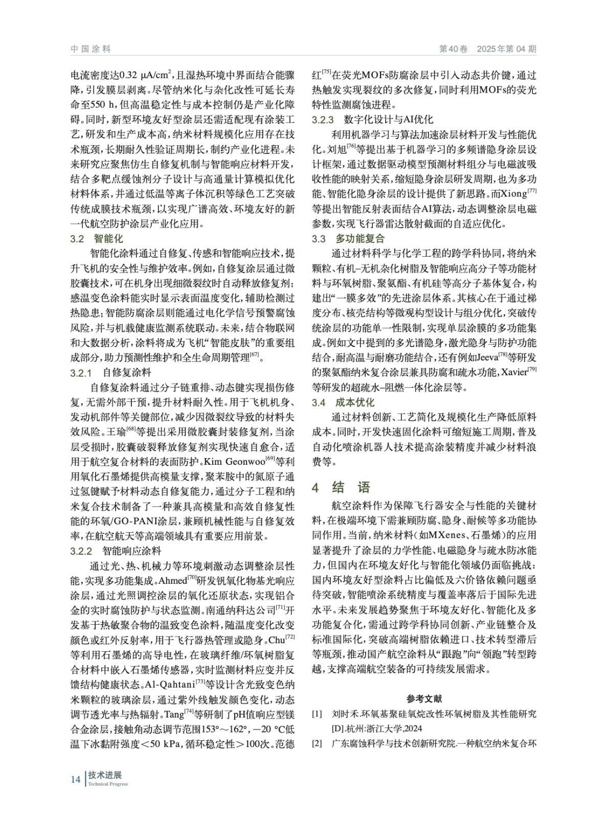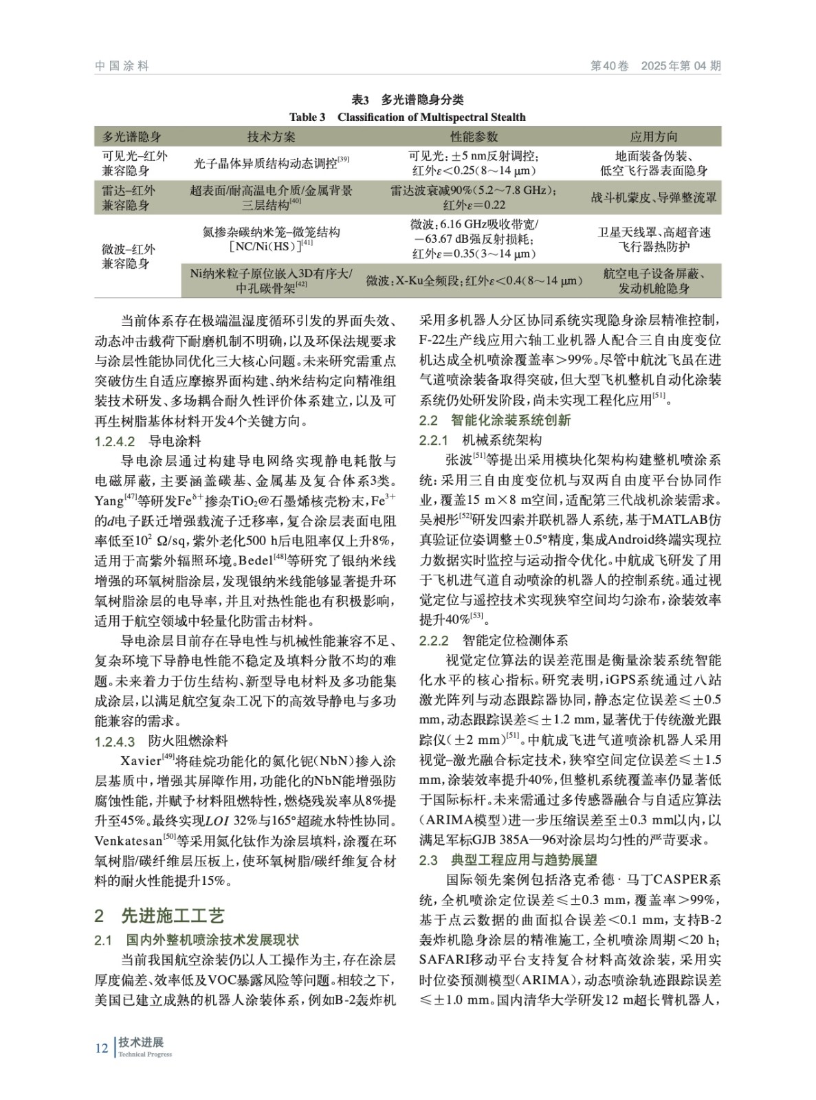 摘要:系統分析了航空涂料的技術體系和研究進展,指出,隨著環保法規趨嚴、智能化需求升級以及輕量化要求,傳統涂料面臨技術瓶頸,亟需通過材料與工藝創新推動其可持續發展。當前研究聚焦于納米填料增強、功能性涂料開發及智能化噴涂工藝優化。國內在環境友好型涂料和智能涂裝系統方面仍滯后于國際水平。材料創新方面,基體樹脂改性通過納米雜化與結構設計顯著提升了力學性能;新型材料則推動了電磁隱身與超疏水涂層的突破。未來航空涂料將向環境友好化、智能化及多功能復合化方向發展。需突破高性能樹脂國產化、智能響應涂層設計等關鍵技術,并通過跨學科協同與產業鏈整合,以突破關鍵材料和技術壁壘,支撐高端航空裝備的可持續發展需求。