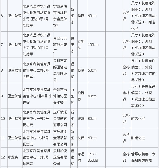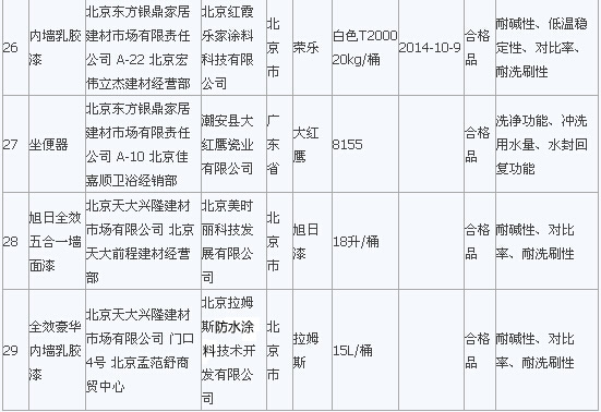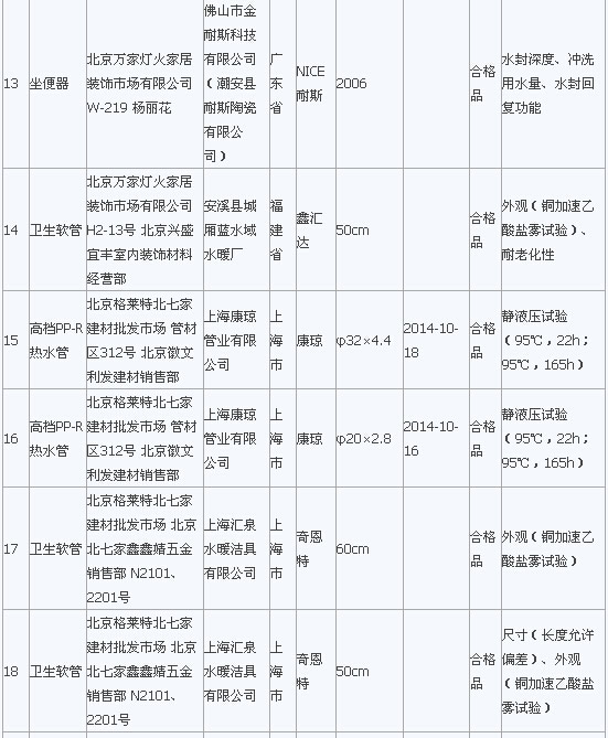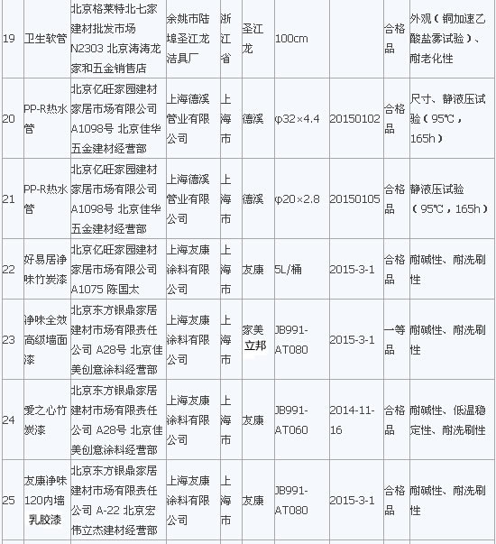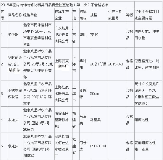 在2015年流通領域商品質量抽檢工作中,北京市工商局對北京市市場上銷售的室內裝飾裝修材料類商品進行了抽檢。抽檢結果顯示膠粘劑全部合格,發現水龍頭、軟管、PP-R管、墻漆涂料等類別中標稱“統用”、“華時麗”、“馬里奧”等品牌29種室內裝飾裝修材料存在問題,主要問題為衛生潔具的洗凈功能、水封深度、沖洗用水量、水封回復功能項目,水龍頭的表面耐腐蝕性能、流量、管螺紋精度項目,墻漆涂料耐堿性、低溫穩定性、對比率、耐洗刷等項目不符合相關標準要求。