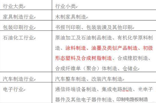 此次征收范圍涉及的5個行業大類中排放揮發性有機物的17個行業小類,具體包括:家具制造行業的木制家具制造,包裝印刷行業的書報刊印刷、包裝裝潢及其他印刷,石油化工行業的原油加工及石油制品制造、有機化學原料制造、涂料制造、油墨及類似產品制造、初級形態塑料及合成樹脂制造、合成橡膠制造、合成纖維單(聚合)體制造、倉儲業,汽車制造行業的汽車整車制造、改裝汽車制造,電子行業的通信終端設備制造、集成電路制造、光電子器件及其他電子器件制造、印制電路板制造。