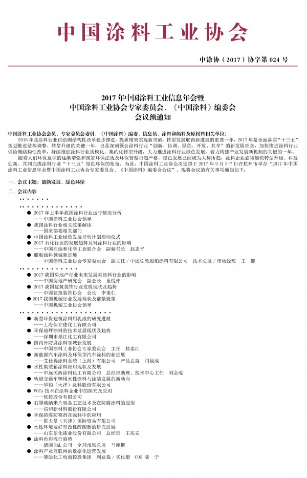 2017年中國(guó)涂料工業(yè)信息年會(huì)暨中國(guó)涂料工業(yè)協(xié)會(huì)專(zhuān)家委員會(huì)、《中國(guó)涂料》編委會(huì)會(huì)議預(yù)通知
