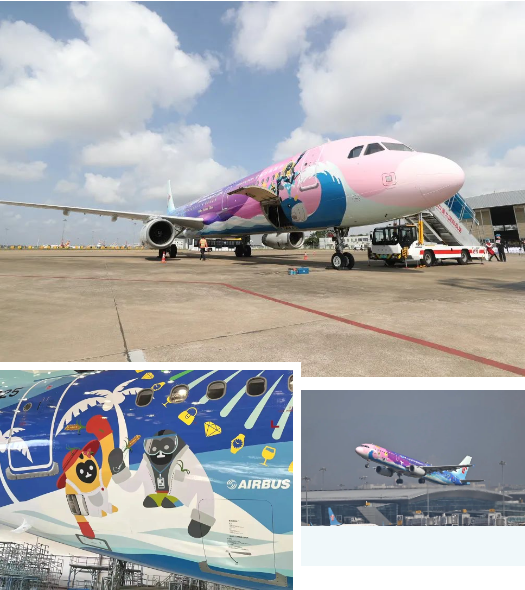 “消博號”主題彩繪飛機選用南航旗下空客A321機型,由南航集團與海南國際經濟發展局合作推出。它的機身以70多種斑斕色彩描繪著在吉祥物們在“南繁、深海、航天”場景下的靈動畫面,寓意著消博會熱情迎接全球企業和消費者的到來。