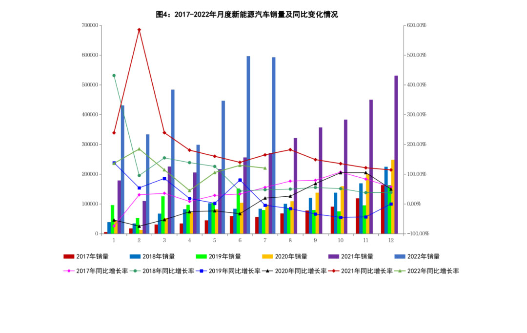 2022年7月,隨著中央穩經濟一攬子政策效應進一步顯現,汽車產銷保持快速增長,當月汽車產銷分別完成245.5萬輛和242萬輛,同比分別增長31.5%和29.7%。新能源汽車延續高速增長勢頭,1-7月市場占有率達到22.1%。