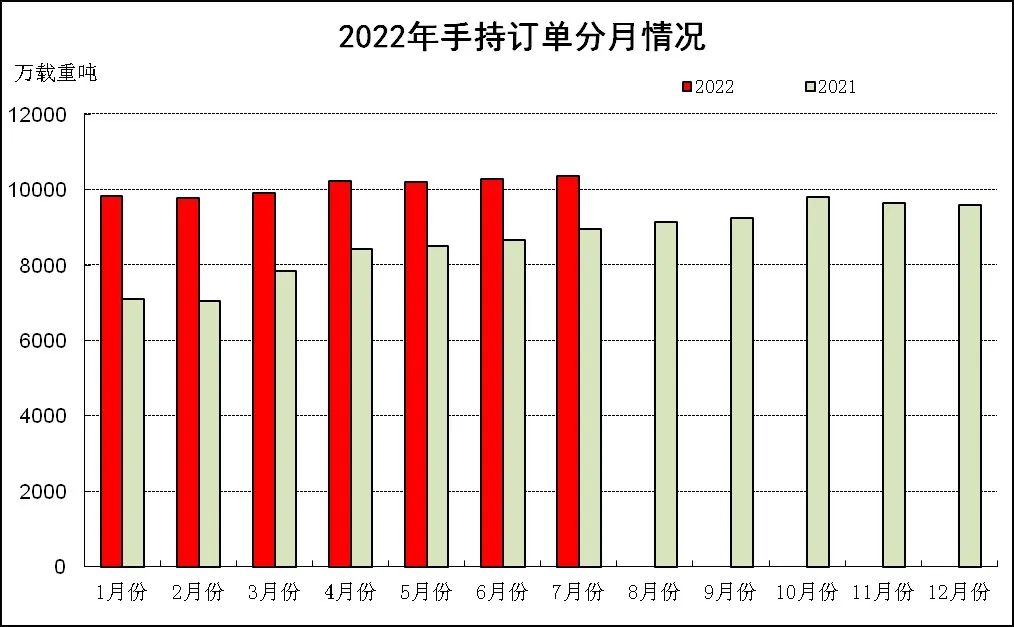 1~7月,全國造船完工量668萬修正總噸,同比增長1.8%;新承接船舶訂單量1242萬修正總噸,同比下降22.4%。截至7月底,手持船舶訂單量4283萬修正總噸,同比增長27.4%。
