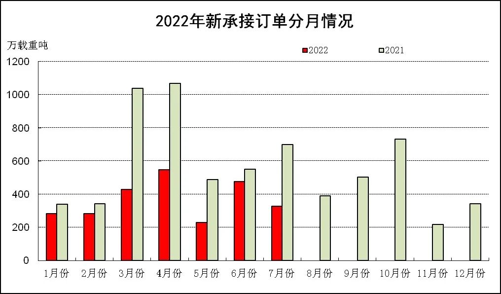 1~7月,50家重點監測造船企業造船完工1995萬載重噸,同比下降15.5%。承接新船訂單2412萬載重噸,同比下降45.0%。7月底,手持船舶訂單10041萬載重噸,同比增長14.3%。