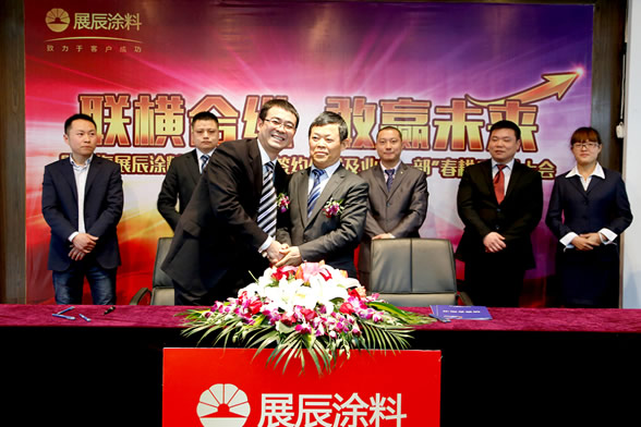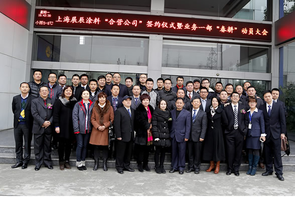 新年伊始、萬象更新。2015年2月2日下午,上海展辰涂料有限公司與三大合營公司正式舉行簽約儀式。董事長陳冰,輪值總裁劉順、輪值總裁孫金平等領導攜集團中心各部門負責人及上海展辰業務一部全體經銷商齊聚一堂,共襄盛舉。
