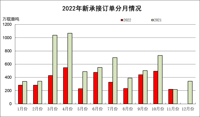 1~11月,50家重點監測造船企業造船完工3203萬載重噸,同比下降8.9%。承接新船訂單3720萬載重噸,同比下降40.2%。11月底,手持船舶訂單10054萬載重噸,同比增長6.1%。