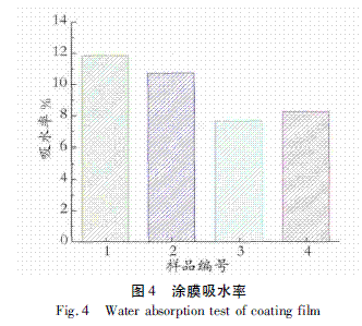 涂膜的吸水率和耐水性對涂層的防腐性能有很大影響,涂層的吸水率越大,耐水性越差,防腐性能越差。4種樣品涂膜的吸水率如圖4所示。