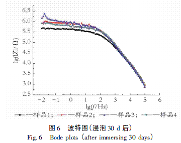 圖6是不同固化劑用量下,試板在3.5%的NaCl水溶液中浸泡30d后的波特圖。