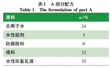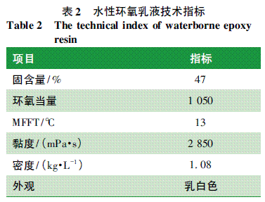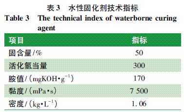 添加去離子水及部分助劑,攪拌15min左右;添加防腐顏料及填料,攪拌30~60min;添加水性環氧乳液及部分助劑,攪拌30min左右,制得A組分。水性環氧乳液和固化劑的技術指標分別如表2、表3所示。