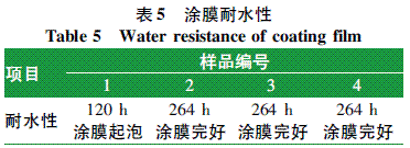 由表5可以看出,當固化劑用量過多時,涂膜耐水性較差,在浸泡120h的時候,涂膜表面呈現較為密集的小泡,這說明涂層中剩余的未參加固化反應的固化劑對耐水性影響比較大。其他比例下,涂膜耐水時間均超過了264h,能夠滿足一般工業涂料的耐水性要求。