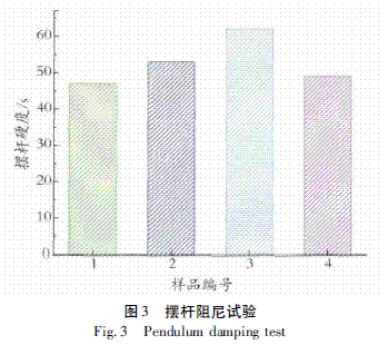 由圖3可以看出,涂膜擺桿硬度隨固化劑用量的減少先增加后減小,即固化劑過多或過少時都會降低涂膜硬度,為確保涂膜硬度較為理想,需一個合適的固化劑用量。當固化劑用量過多時,固化交聯反應結束后會有固化劑剩余,而剩余的固化劑分子在涂層中相當于增塑劑的作用,會降低涂膜硬度,隨著固化劑用量的減少,固化交聯后剩余固化劑的量減少,增塑作用減弱,涂膜硬度增加。當固化劑用量過少時,因固化劑不足導致涂層交聯密度較低,涂膜硬度又有所降低,因此,合適的固化劑用量為涂膜硬度提供了一個保證。