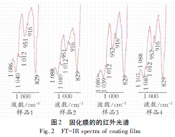 (1)紅外光譜測試樣品制備:直接用環氧乳液與固化劑按照表4比例制備樣品,攪拌均勻后,放置15~20min進行熟化,然后在氯化鈉晶片上涂上薄薄的一層,固化完成后放在干燥器內干燥24h以上待用。