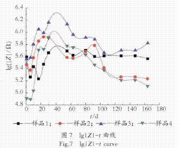 圖7是不同固化劑用量下,|Z|0.01(頻率為0.01Hz時的交流阻抗值)隨時間變化曲線。