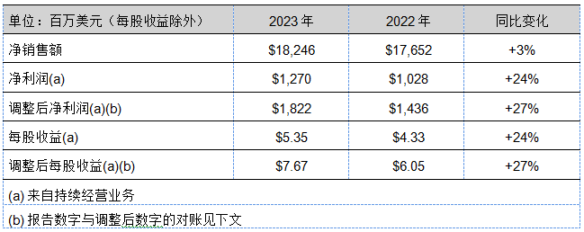 2023年度實(shí)現(xiàn)了創(chuàng)紀(jì)錄的凈銷售額,約為182億美元,較上年增長3%左右。在銷售價格上漲的帶動下,有機(jī)銷售額增長了3%。調(diào)整后每股收益也創(chuàng)下歷史新高,增長了27%,原因包括銷售價格上漲、投入成本下調(diào)、結(jié)構(gòu)性成本節(jié)省和有利的外幣折算,但被銷量下降部分抵消。年末,投入成本和庫存水平仍高于歷史水平。