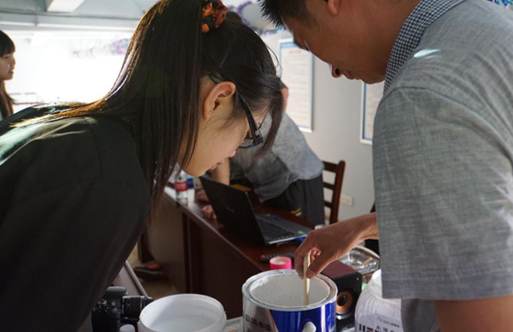 拿起板刷,在樣板上來回涂抹;風干后,學生們觸摸漆面的質地,觀察成品的效果,在實地研究學習水漆涂裝效果。近日,根據高等教育有關校企合作走“產、學、研”相結合道路的發展要求,武漢華中科技大學建筑系14級學生前往晨陽水漆武漢旗艦店實地觀摩學習水漆的調配與涂刷過程。晨陽水漆武漢地區銷售代表王金偉為同學們進行了地坪漆及內墻漆種類、參數、施工方法等一系列的培訓講解。