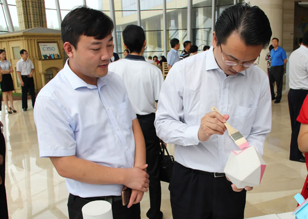 19日,中科院專家一行在保定市科技與知識產(chǎn)權(quán)局的帶領(lǐng)下重點對晨陽水漆進行了參觀考察,先后觀摩了晨陽水漆宣傳片、工程施工樣板、企業(yè)生產(chǎn)車間,并在現(xiàn)場試刷體驗。專家們對晨陽水漆的環(huán)保特性表現(xiàn)出了極大的興趣,對粉刷完的小玩具愛不釋手,紛紛表示今后愿意以身作則,充當(dāng)水漆的推廣員。