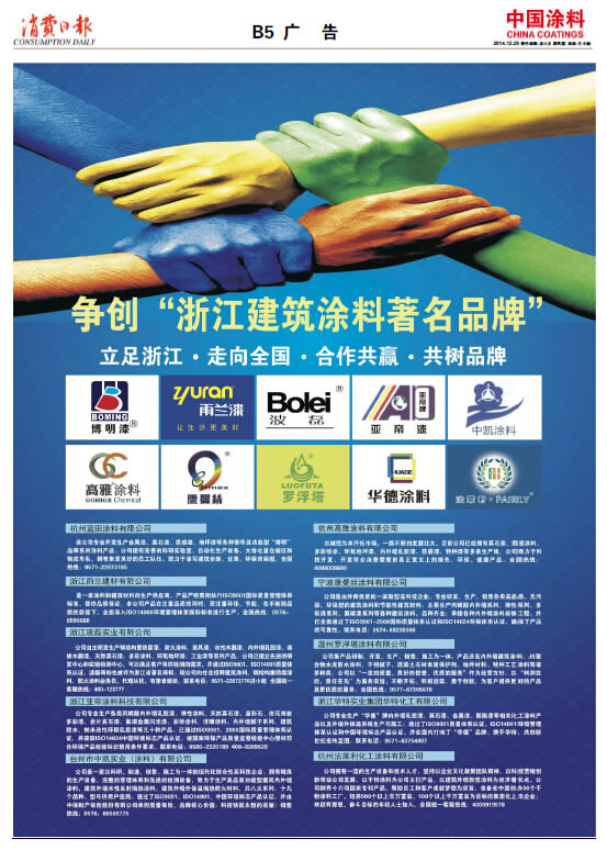 《中國涂料報》(電子版)的一切內容(包括但不限于文字、圖片、PDF、圖表、標志、標識、商標、版面設計、專欄目錄與名稱、內容分類標準以及為讀者提供的任何信息)僅供中國涂料信息網讀者閱讀、學習研究使用,未經中國涂料雜志社有限公司及/或相關權利人書面授權,任何單位及個人不得將《中國涂料報》(電子版)所登載、發布的內容用于商業性目的,包括但不限于轉載、復制、發行、制作光盤、數據庫、觸摸展示等行為方式,或將之在非本站所屬的服務器上作鏡像。否則,中國涂料雜志社有限公司將采取包括但不限于網上公示、向有關部門舉報、訴訟等一切合法手段,追究侵權者的法律責任。