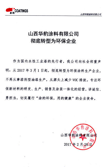 2017 年2 月28 日山西華豹涂料 有限公司發(fā)表聲明稱,從2017 年3 月 1 日起徹底轉(zhuǎn)型為環(huán)境友好型涂料生 產(chǎn)企業(yè),不再?gòu)氖氯軇┬屯苛仙a(chǎn), 從源頭上減少VOC 排放。